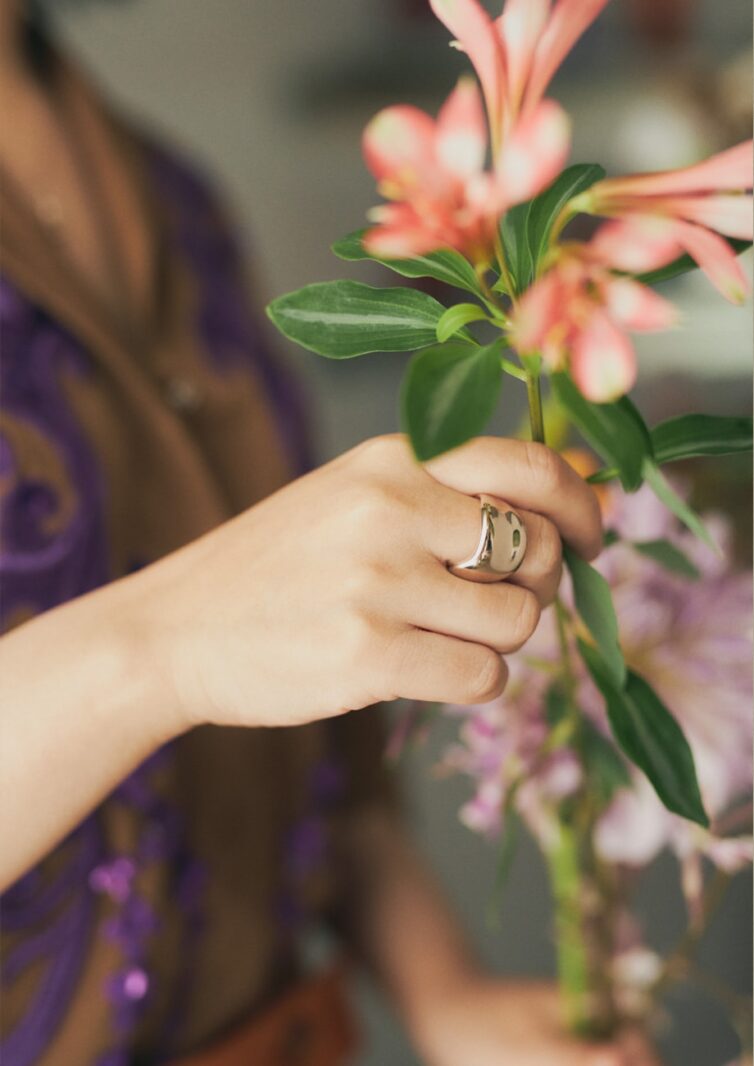 「花屋は黒い服というイメージがあるかもしれませんが、私は自分が好きな服を着て仕事をしています。だからこのスタイリングみたいに、カラーonカラーの配色を楽しむことも。花とファッションがお互いに引き立て合うような色合わせが素敵だなと思うんです。アースカラーをベースに鮮やかな色彩を取り入れたスタイリングと“Raw Brown Gold”はすごく相性がいいですね。イエローゴールドだと華美になりすぎてしまうところがうまくなじんでくれると感じました」