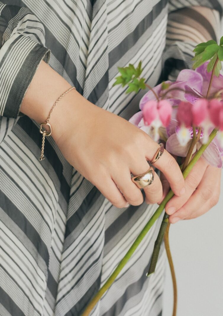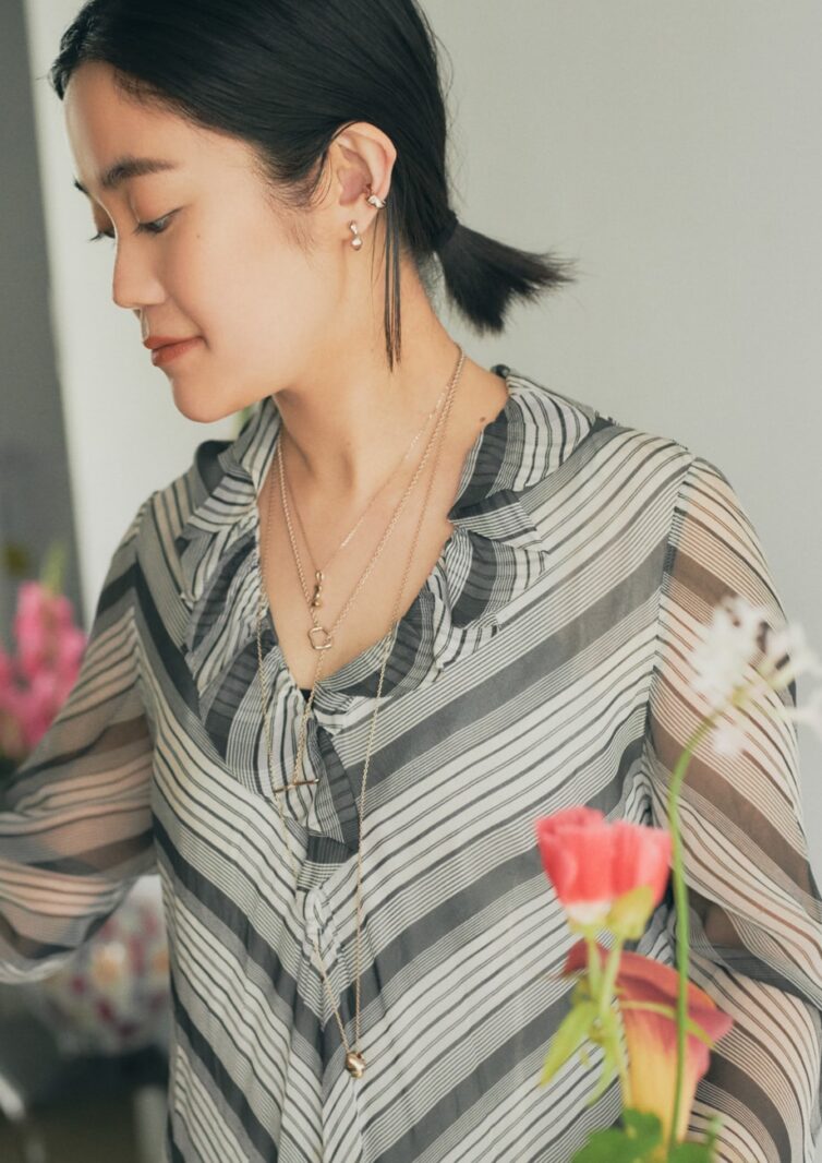 「シルバーのようにも見える絶妙なブラウンゴールドだから、モノトーンカラーとも相性がいいと思います。ジュエリーは直感で選んで合わせていたのですが、よく見るとワンピースの直線的な柄とジュエリーの曲線的なフォルムの対比が面白いスタイリングになりましたね。お花もファッションも、色や形、質感すべてにおいて相反するものを組み合わせてひとつの世界観をつくるのが好きで、そのアンバランスさを楽しんでいます」