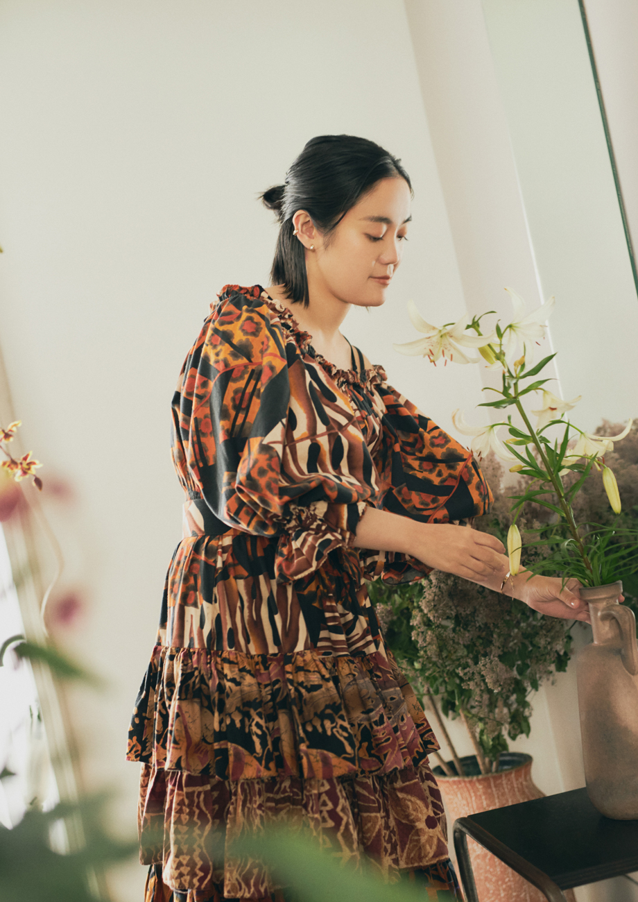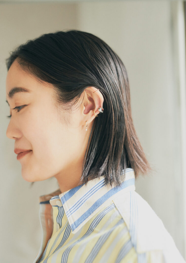 イヤリングとして耳たぶに着けたツイストデザインの“ハグイヤリング”をはじめ、顔の輪郭をなぞるように耳の縁を飾ったレイヤード。「柄×柄のコーディネートだからこそ、ジュエリーの色味は抑えつつ、フォルムのミックス感を楽しみました。着ける位置も耳たぶや耳の縁に挟んだり、内耳に引っ掛けたりとランダムにすることで動きのあるスタイリングに。ブーケをつくるときもそうですが、集まっている部分と散っている部分を意識するとバランスよく見えます」