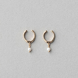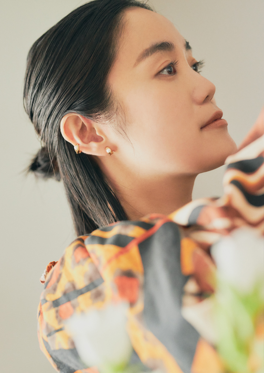 正面に付いたパールが印象的なデザインの“ハグイヤリング”は、片耳に寄せてアシンメトリーに。普段シンプルにジュエリーを身に着ける人にもおすすめのレイヤード。「エスニックテイストの大胆な柄のワンピースには、あえて異なるイメージを持つ艶やかなパールのイヤージュエリーを合わせました。洋服が鮮やかな分、ジュエリーは控えめにレイヤード。同じものを片耳に2個着けて少しだけひねりを加えたスタイリングが可愛いですし、私好みなバランスです」