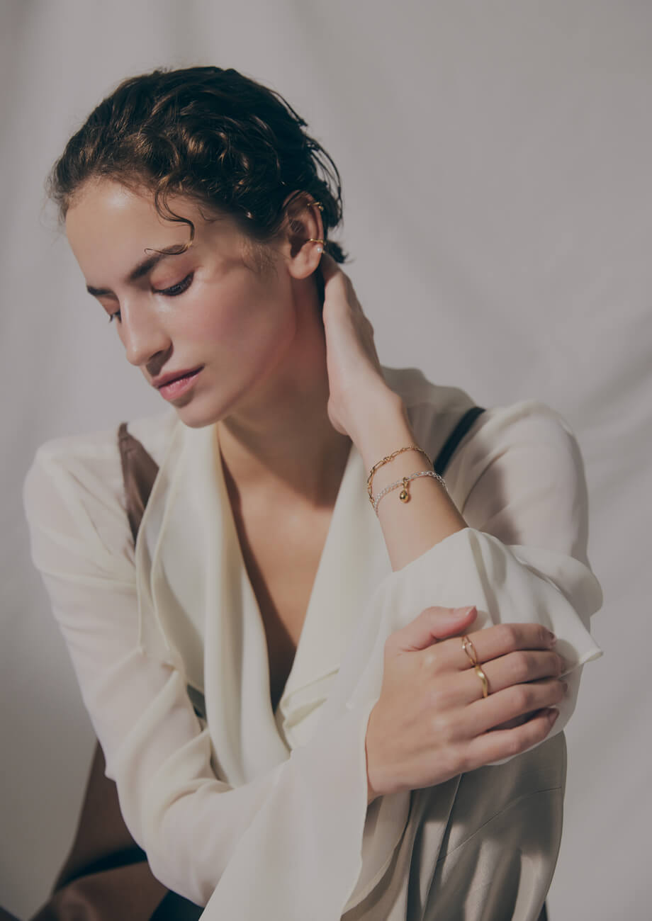 年齢や性別はもちろん、多彩なテイストにもなじむシェアブレスレット。袖や襟にフリル感のあるブラウスに合わせたのは、取り外し可能なチャームが華麗に揺れるデザイン。種類の異なるデザインチェーンをイエローゴールド1色で仕上げたブレスレットを重ね、シルバーカラーとの対比を楽しんで。耳や指もイエローゴールドでまとめて統一感を。
