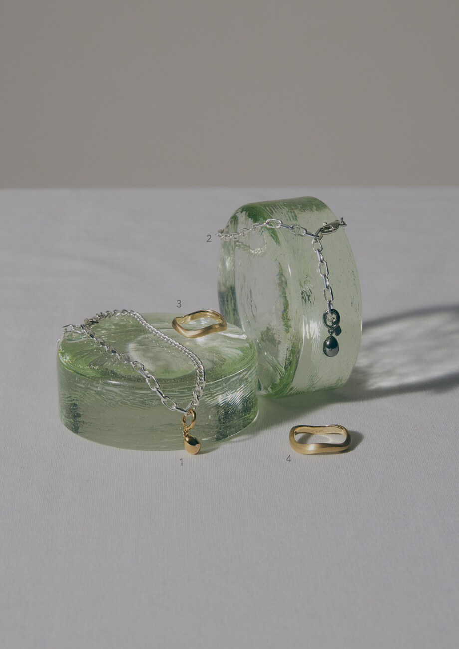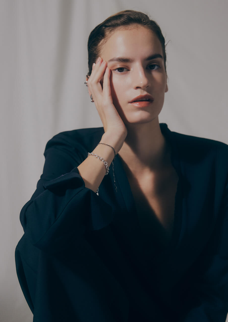 襟にデザインの効いたハンサムなジャケットは、艶やかなシルバーでまとめつつ、ブラックルテニウムコーディングを施したブレスレットでひとさじの遊び心を加えて。分量感のあるチェーンブレスレットを重ねながらも、全体的に丸みを帯びたフォルムのジュエリーを選ぶことで、クールな印象だけに留まらない、鮮度の高いスタイリングに仕上がる。