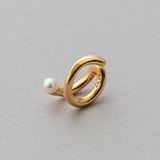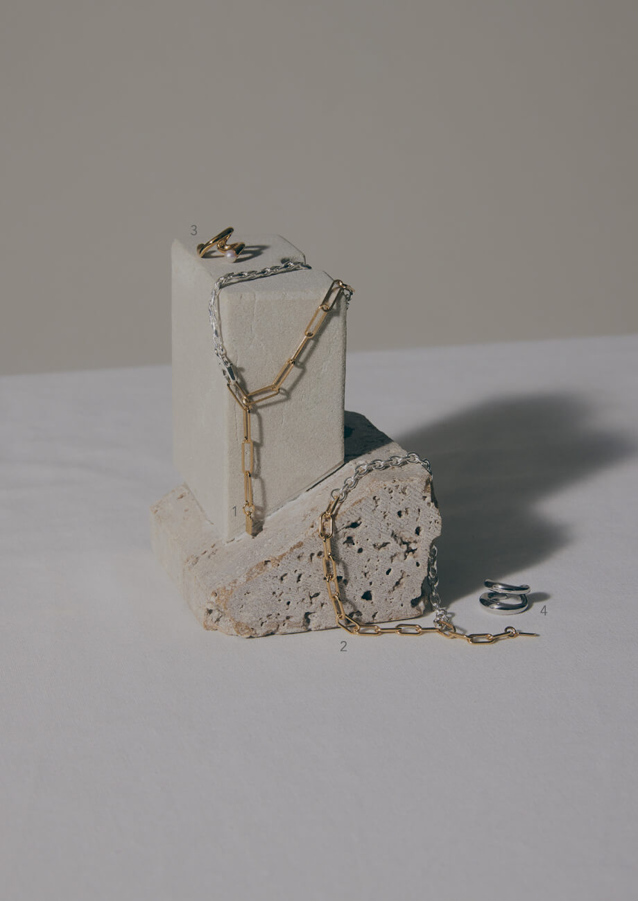 一見すると同じアイテムを身に着けているように見えて、実は微妙にデザインの違うブレスレットを選び、さりげなく個性をアピール。長方形のチェーンが都会的な1本にはパールが付いたゴールドを、丸みを帯びたチェーンが上品な1本にはシンプルなシルバーと、異素材のピークカフを耳元に加え、さりげなく雰囲気を揃えて。
