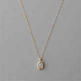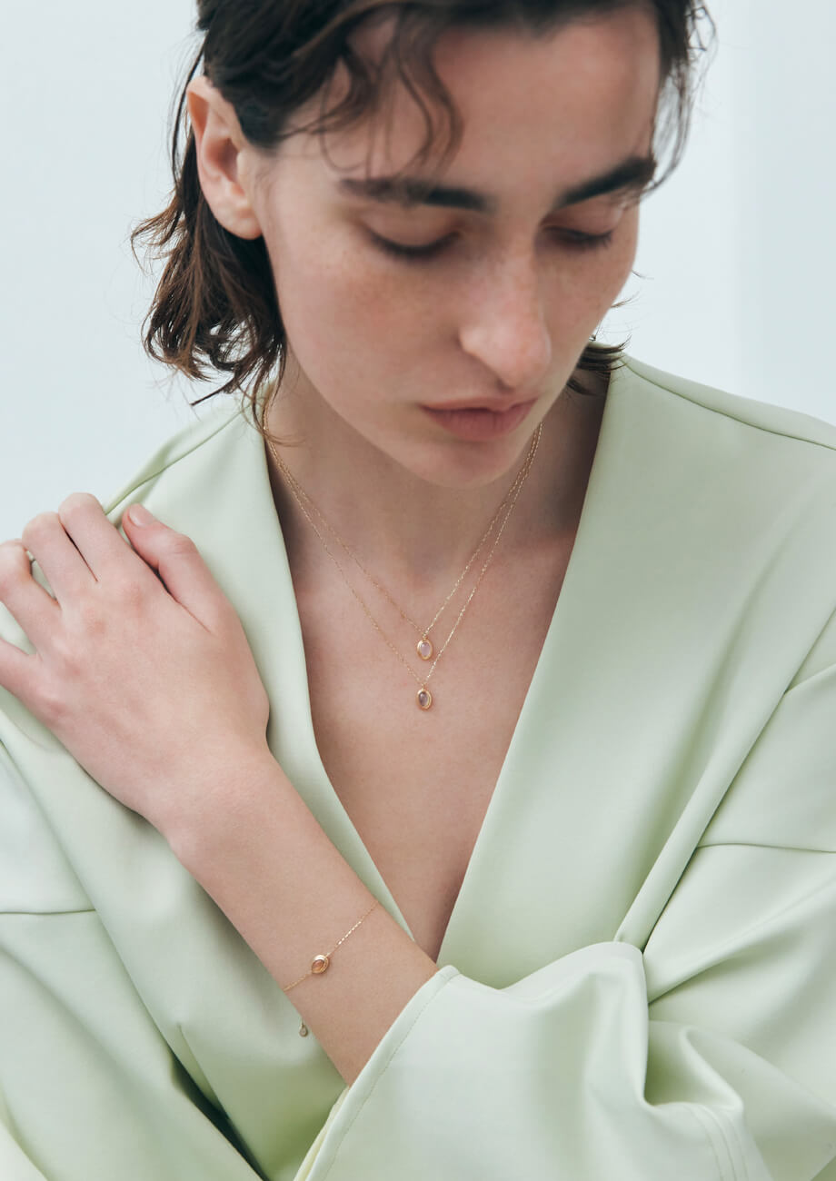 化粧品のコントロールカラーに着想を得て、肌を整えるイメージで選ばれた3種類の天然石。素肌をトーンアップさせ、明るい印象へと引き上げる「ブルーカルセドニー」、自然な血色感をもたらし、健康的な雰囲気を演出する「オレンジムーンストーン」、色石が持つ多彩なきらめきがラメのような艶感と華やかさをプラスする「ラブラドーライト」が揃う。いずれも、透明感あふれる生き生きとした輝きを放ち、ピュアなときめきを呼び覚ますよう。まずは、顔周りに近いネックレスから。手元にブレスレットも重ね、春色グラデーションを楽しんで。