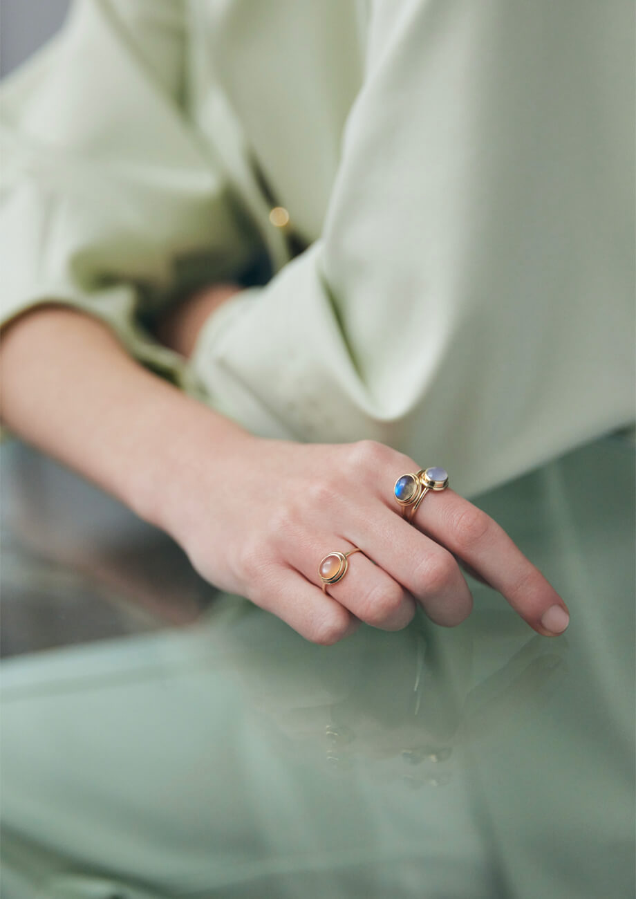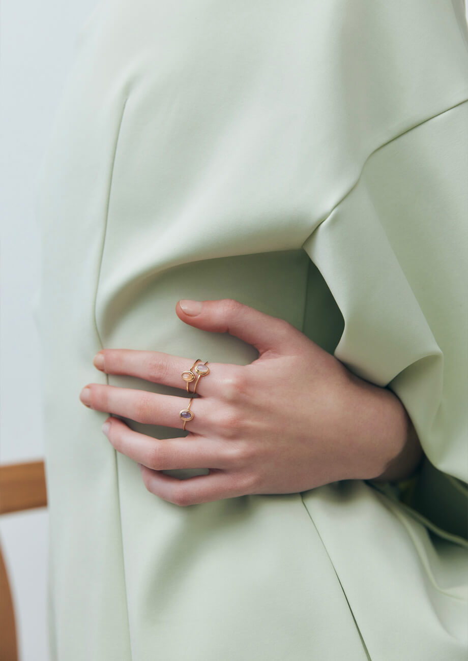 ピンキーリングがトレンドに浮上するなど、今季のリングはデザインもサイズも豊富。本コレクションでも、大ぶりのものと小ぶりのものの2種類を展開しているので、気分や好みに合わせて選びやすいはず。ネックレス、ブレスレット、リングすべて、2段の覆輪留めにより石が実際よりも大きく、華やかに見えるデザインで、ぷっくりと存在感のあるこちらのリングは、石の輝きを贅沢に楽しめる。優しく穏やかな色味の天然石だからこそ、自由なカラーミックスで、服もあえてカラフルに。春の明るさや陽気なムードを満喫して。