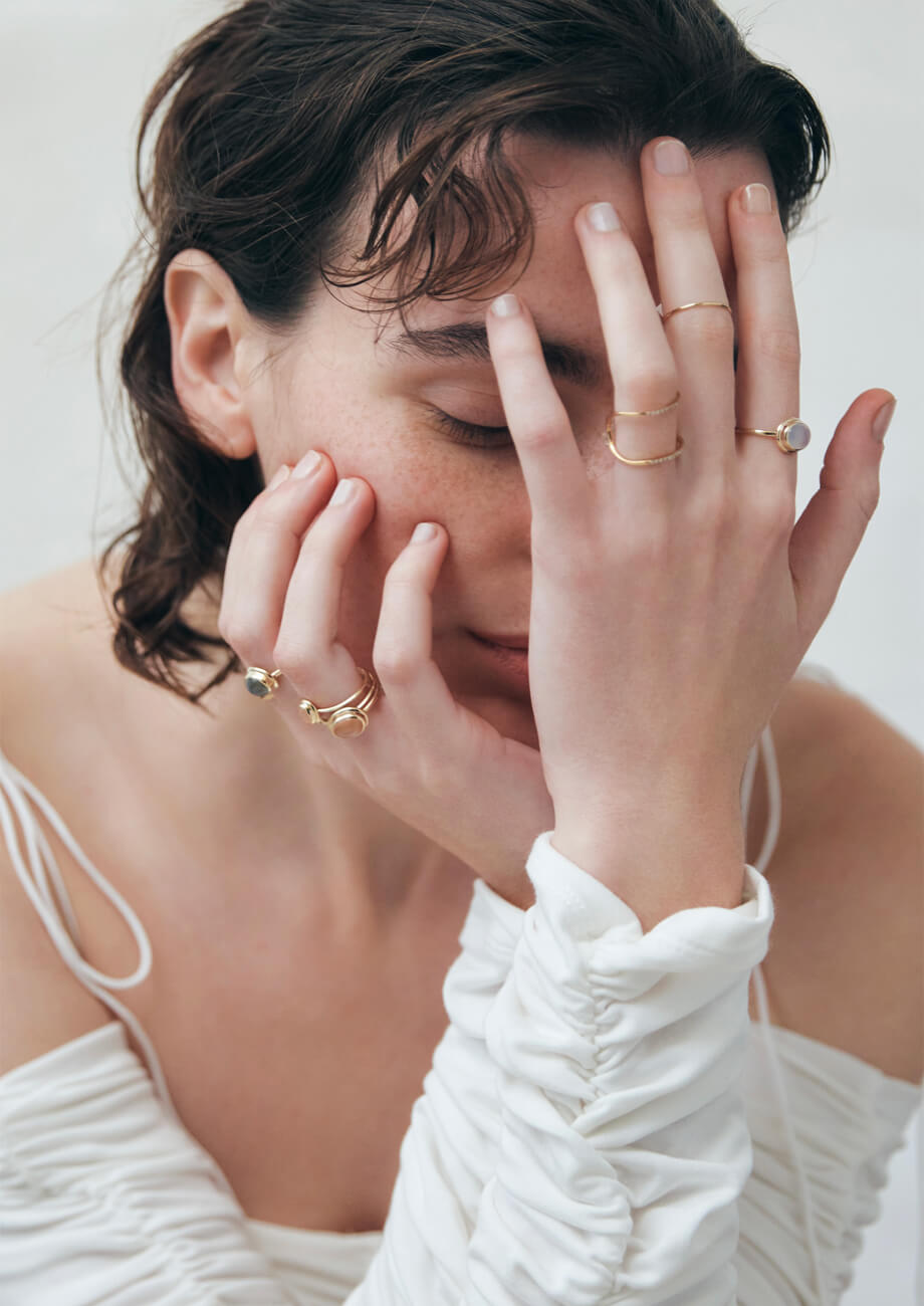 今季、初めて色石ジュエリーにトライしたい人は、ウェーブを描いたアームが軽やかな印象を呼び込むこちらの小ぶりなデザインを。1本でも神秘的な自然の美しさを纏えるけれど、繊細なストーンリングなら、カラーの異なるものをレイヤードしても、天然石同士が品良く調和して難なく仕上がる。また、きれいな素肌は適度な色のバラつきで構成されていると言われており、この3種類の天然石の重ね着けは透明感、血色、艶を備えた理想の肌印象を叶える効果も期待できそう。顔周りはネックレス、手元はリングとアイテム違いでの組み合わせもおすすめ。