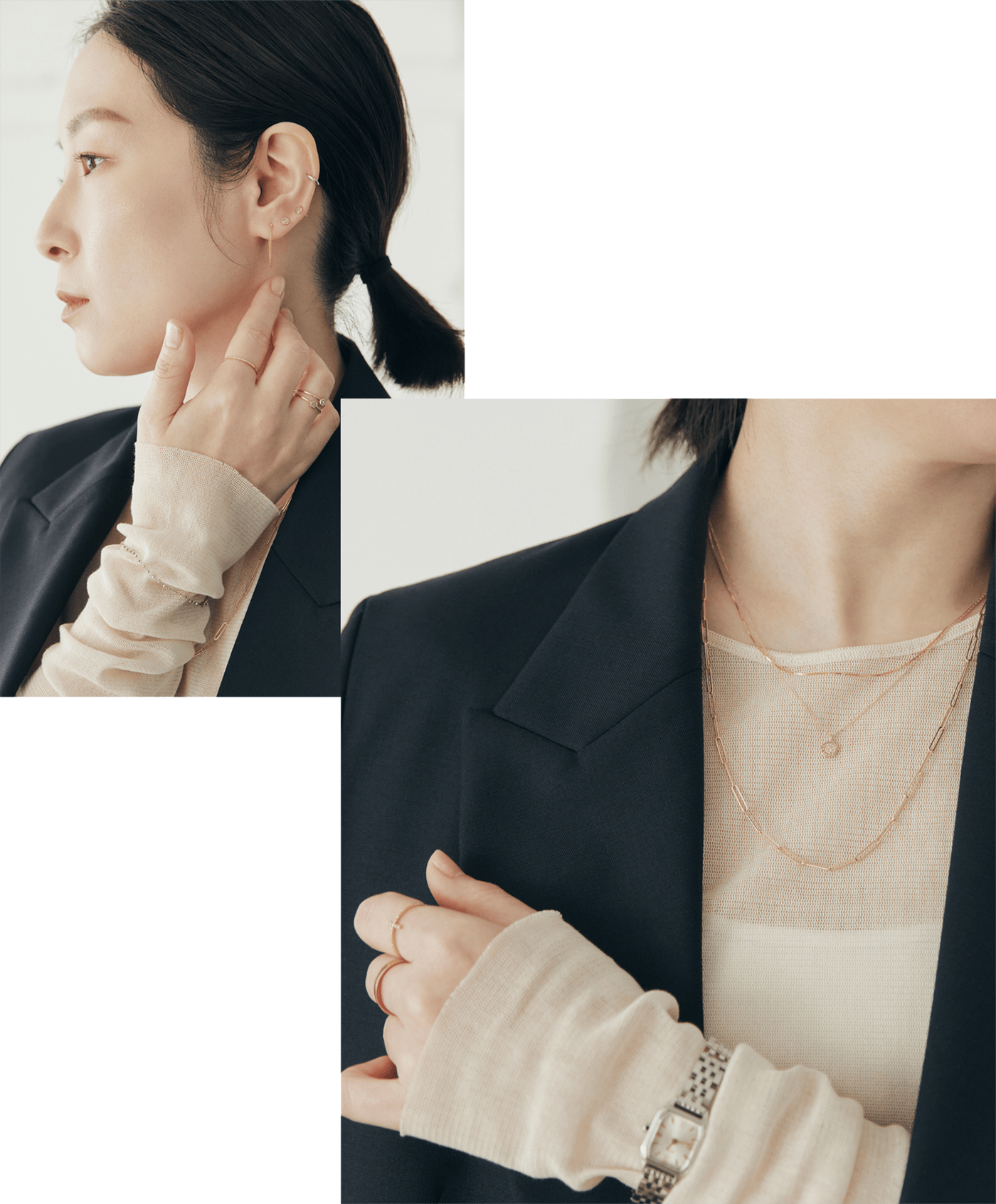 Nozawa 「“Brilliant”は、耳、首、指に着用しています。ミニマルなデザインのピアスは、あえて片方の耳にまとめることも。肌なじみの良いブラウンダイヤモンドなら、2個並べてもシックな雰囲気に仕上がります。ネックレスはジャケットのラペルに合わせてV字に落ちる45cmチェーンのものを選びました。そこに、角を感じられる大きいコマのチェーンやベネチアンチェーンを重ねてシャープな印象に。そしてリングは、ブラウンダイヤモンドとホワイトダイヤモンドを1本の指に重ねて遊び心を出しました。石座がロジウムコーティングされているダイヤモンドのリングは、ブレスレットの色味とさりげなくリンクさせています」