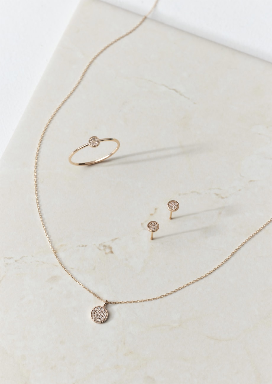 「石畳」とも称されるパヴェの技法を用い、ピアスとリングには7石のダイヤモンドを、今季新たに登場したひとまわり大きいサイズ感のネックレスには14石のダイヤモンドをセッティング。イエローゴールドにブラウンダイヤモンドをあしらったジュエリーは、落ち着いた輝きで肌なじみが良く、着こなしにさりげない華やかさを添えてくれる。