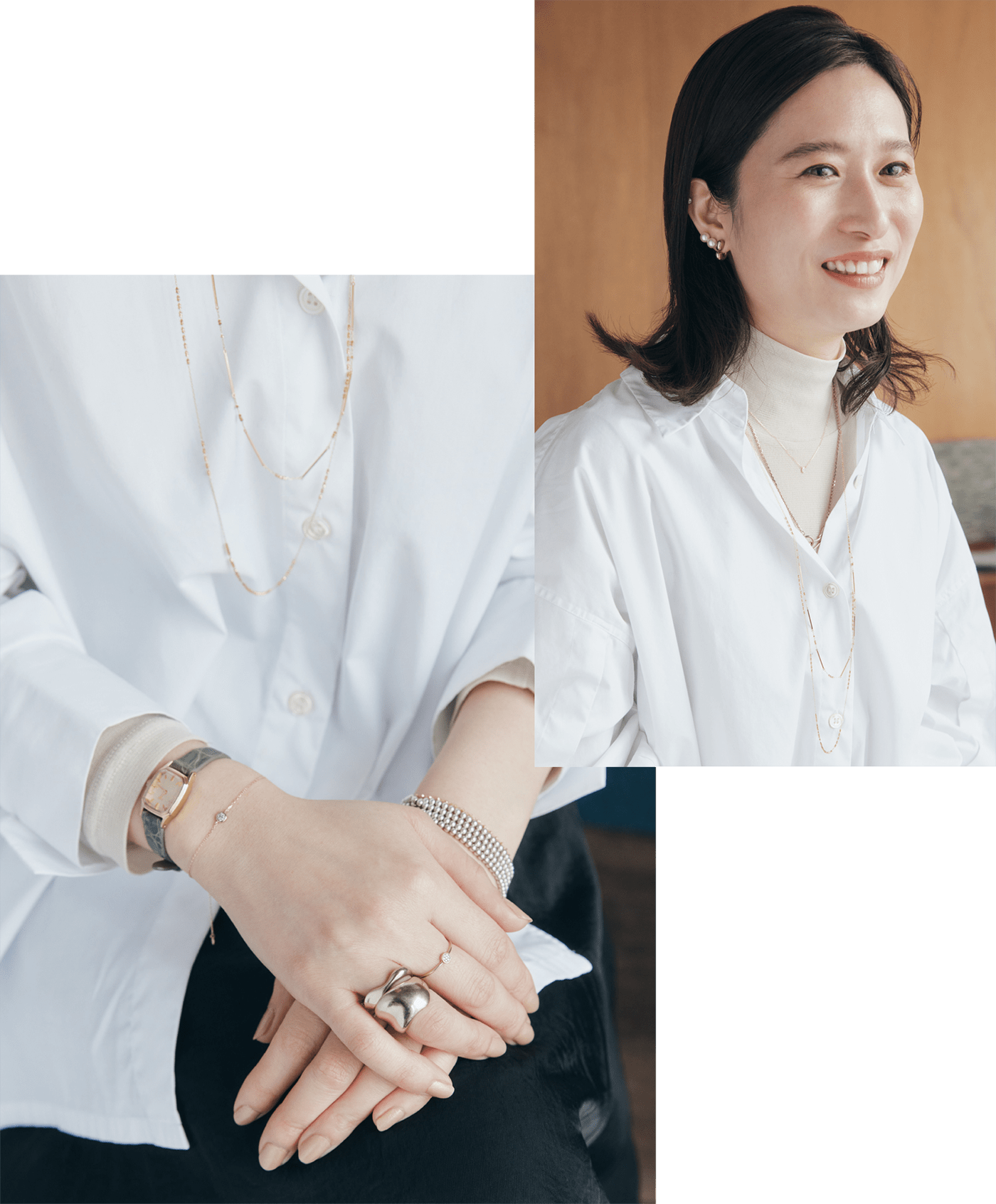 Kosugayama 「爽やかな白シャツで春らしさを意識しつつ、ネックレスが映えるように中に透け感のあるトップスを着ました。普段からシンプルな服が多いので、ジュエリーはとことん盛るタイプ(笑)。今回も、上品さとファッション性を併せ持つ“Brilliant”の自由度の高さを味方に、素材もボリューム感も異なるジュエリーを重ねてスタイリングしました」