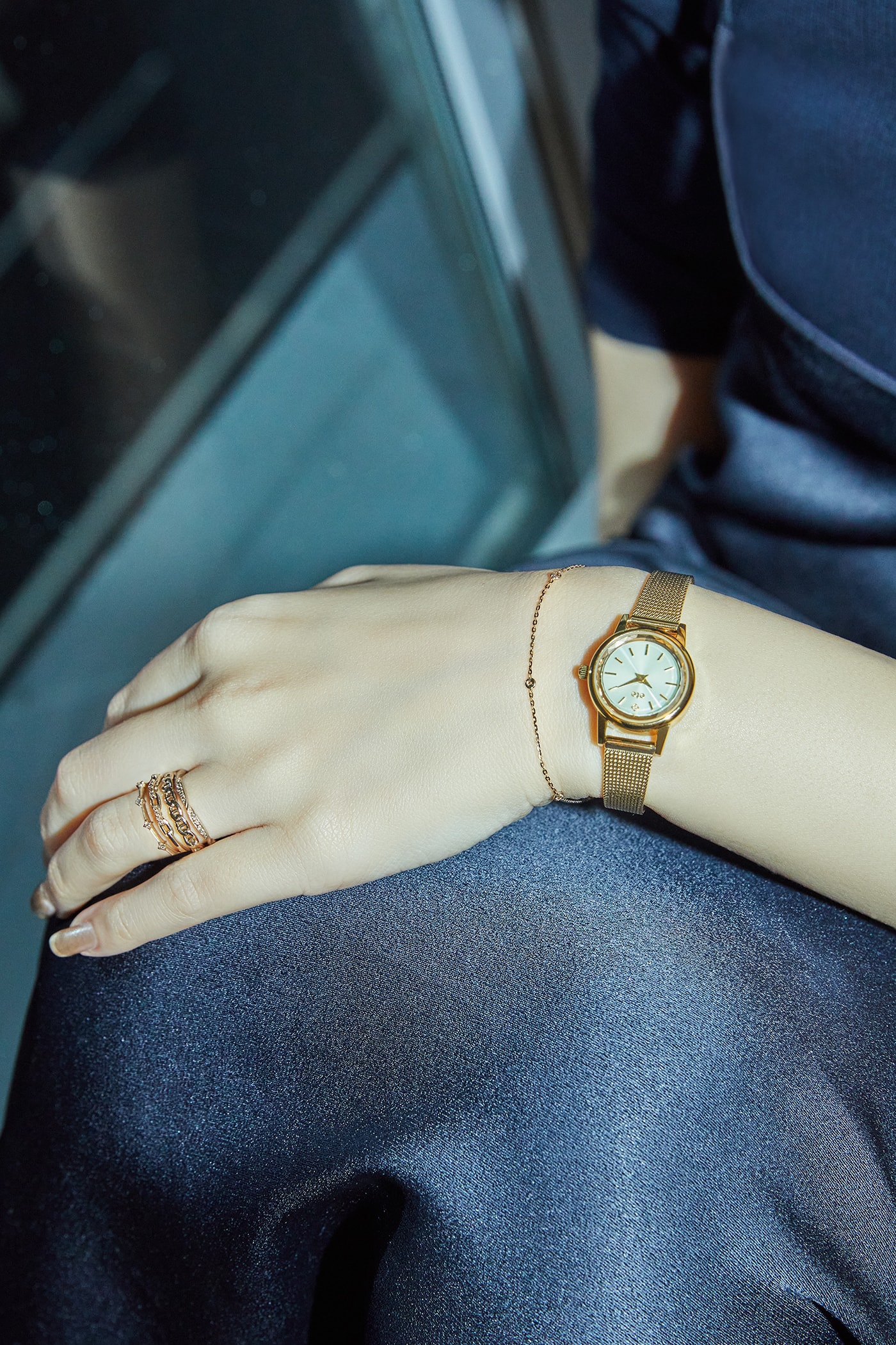 「ジュエリーライクなメッシュベルトのウォッチが、より上品に見えるようスタイリングしました。薬指の大胆なレイヤードを楽しむのが最近のわたしの定番スタイルです。“Tone”のロウブラウンゴールドリングは、数本重ねて着けても落ち着いた煌めきが品格をキープしてくれるのでおすすめ。色を揃えたリングとイエローゴールドのウォッチによるコンビカラーが華やかさを運んでくれます」(小野寺)