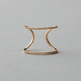 「黒の文字盤や落ち着いたダークブラウンカラーのベルトには、ロウブラウンゴールドのジュエリーが相性抜群。フェイスの存在感を引き立たせつつ、印象を和らげてくれる薬指のリングの曲線を主役にスタイリングしました。小指にはシグネットリングと、ダイヤモンドがちらりと覗く遊び心に溢れた“Layered”のコンビカラーリングを。ボリューム感のあるジュエリーを多く選ぶときは、着ける箇所を最小限にすることでまとめやすくなります」(平野)