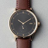 フェイスとベルトをつなぐ一本足のディテールがアイコニックなリストウォッチは、リザードベルトとゴールドのコンビがレトロな気分をさらに誘う。ムーブメントやベルトはすべて国内生産によるもので、スリムなフェイスに対して硬度の高いサファイアガラスや秒針を採用。高い技術と品質への強いこだわりを込めた。