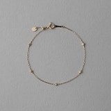 「クラシカルなウォッチのムードが活かせるように、腕まわりはベルトと同じくニュアンスカラーのブレスレットをチョイスしました。ベルトのグレイッシュな印象からインスピレーションを受けて選んだ、天然石リングを手元の主役に。そこに“Layered”のダイヤモンドリングを重ねて、艶っぽい表情をさらに底上げ。上品すぎてしまうといつものわたしらしくないので、サムリングを入れてカジュアルさをプラスしています」(小野寺)