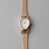 有機的なフォルムが特徴のフェイスに、ぷっくりと丸みを帯びたガラスケースが瑞々しいミストピンクカラーのリストウォッチ。白蝶貝(シェル)を使用した文字盤には、まるでオーロラのような豊かな色彩が浮かびあがる。やわらかな表情と、リングのアームをイメージしたステンレス製ベルトのスタイリッシュな空気感をこの一本にミックス。