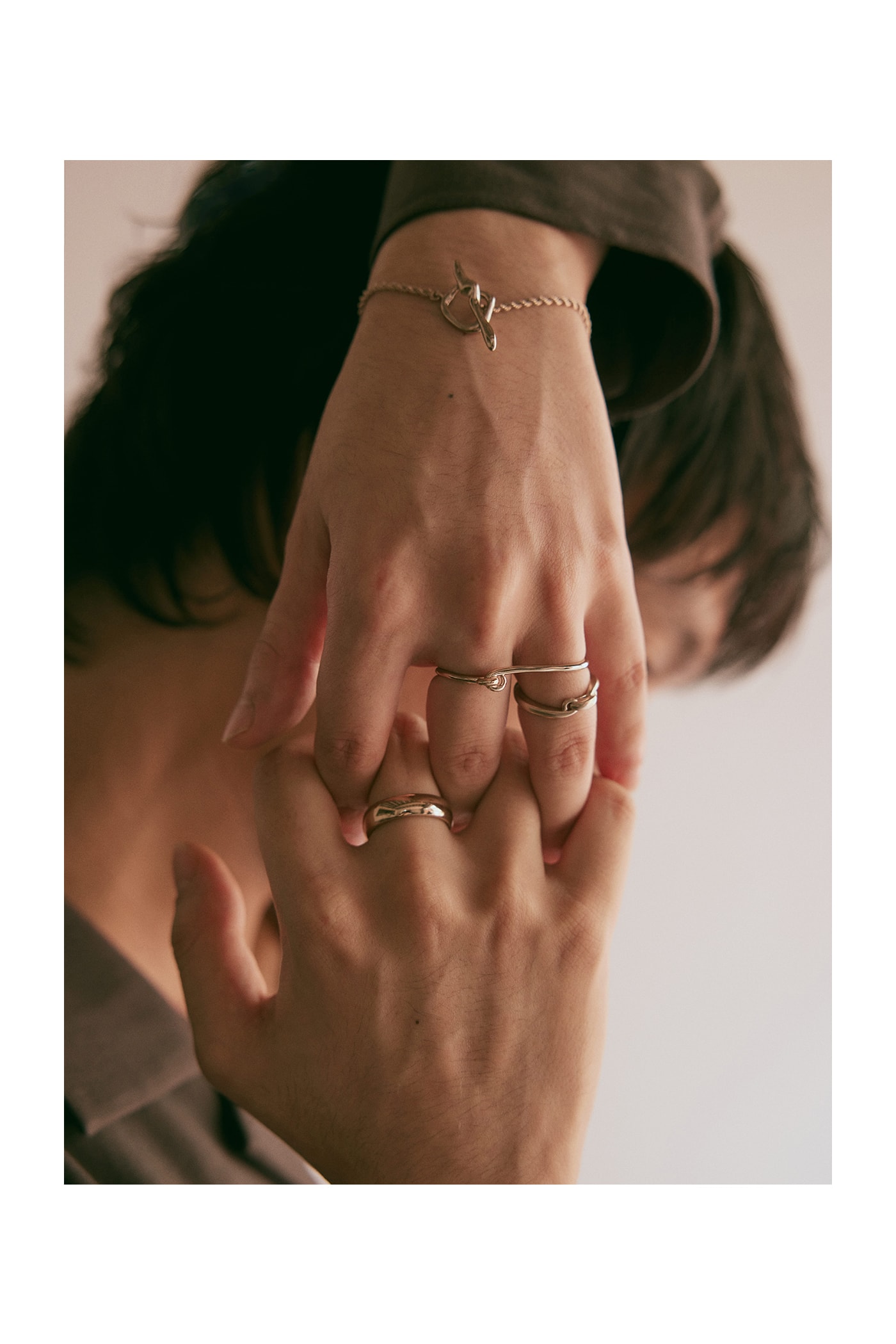 “ノット(結び目)”モチーフをデザインに採用したムード ダブルリング(左手中・薬指)は、1つのリングを2本の指に通す大胆な見え感と、フリーハンドのようなエアリーな曲線が特徴。タイトなラインからボリュームのあるシルエットへと変化していくチェーン リング(左手薬指)は、表面にランダムヘアライン加工を施してマットな質感に仕上げた。身に着けるだけで頼もしい姿を演出してくれるのは、存在感がある線を描いた“Raw”ならではの魅力のひとつ。シンプルなラインのリング(右手中指)を1点取り入れると、手元のバランスは良くなり、ジュエリーの華やかさがさらに増していく。