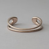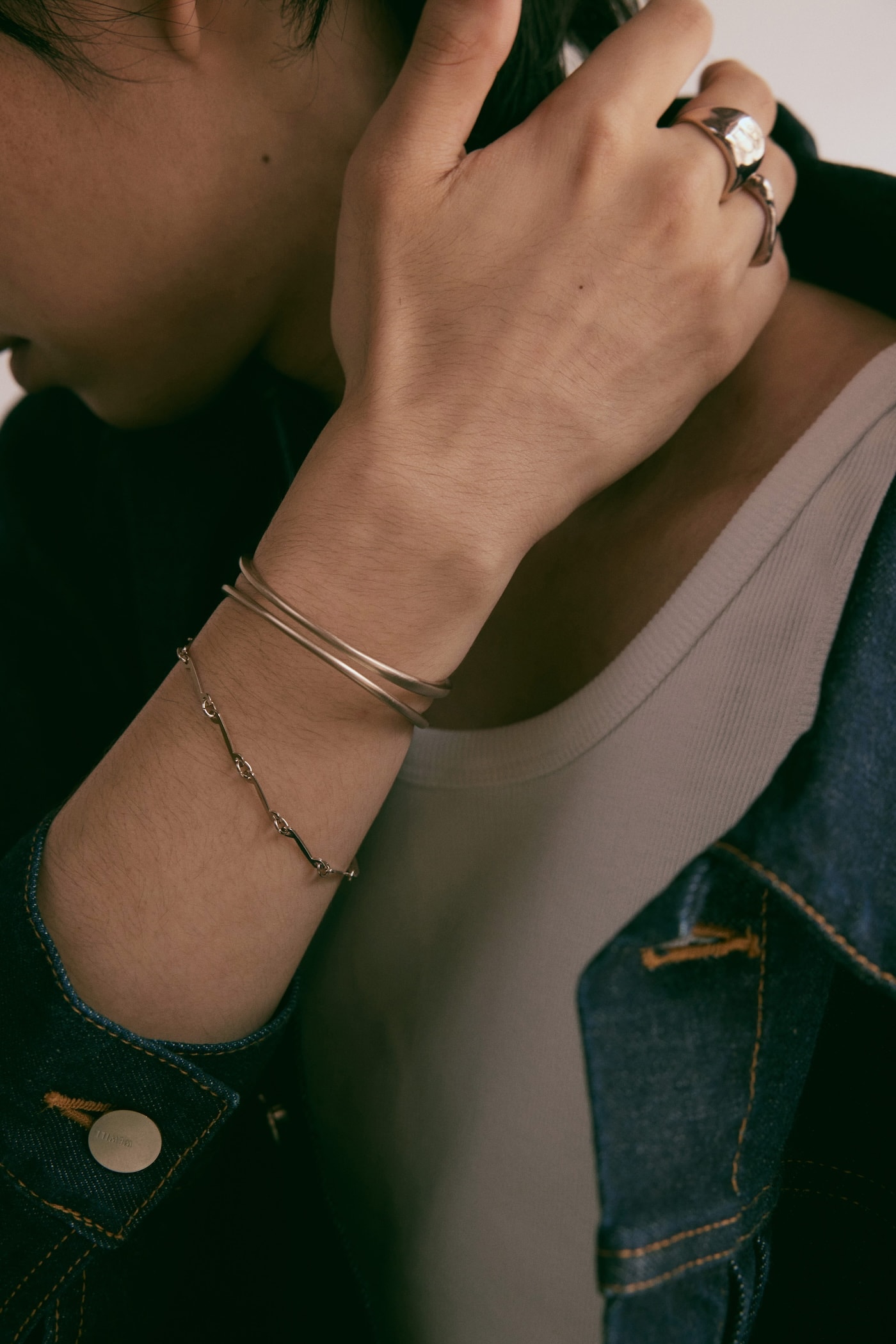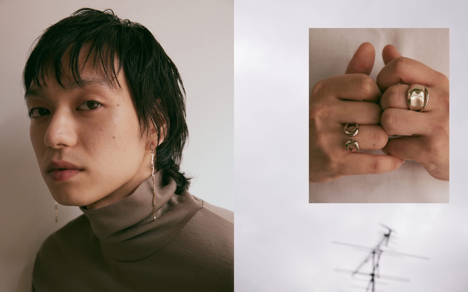 2種類のリング(右手中指&薬指)は、ロウブラウンゴールドの肌馴染みの良さに加えて、人間のボディーラインをイメージした有機的なシルエットを手元で描く。ダブルライン バングル(右腕上)は、フロントだけ見ると2本のタイトなライン。サイドからバックにかけて、バルキーなフォルムにゆっくりと変化していく。パーツ ブレスレット(右腕下)は、移ろう風のようなムードを、連続するパーツで表現したデザイン。コレクションテーマの「微かな移り変わり」をジュエリーで演出しながら、ジェンダーニュートラルなエッセンスを全体に散りばめた。