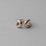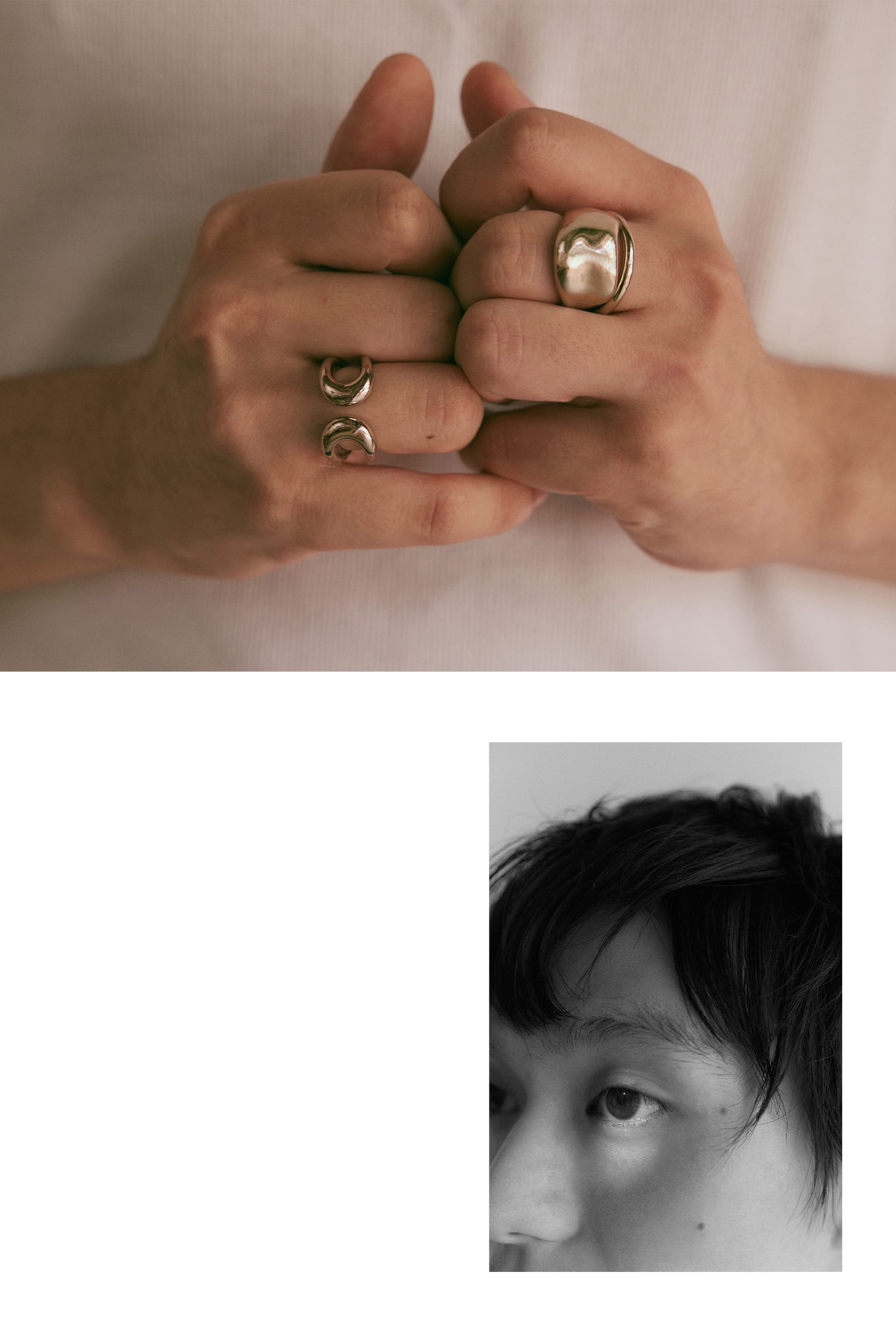 “ノット(結び目)”モチーフをデザインに採用したムード ダブルリング(左手中・薬指)は、1つのリングを2本の指に通す大胆な見え感と、フリーハンドのようなエアリーな曲線が特徴。タイトなラインからボリュームのあるシルエットへと変化していくチェーン リング(左手薬指)は、表面にランダムヘアライン加工を施してマットな質感に仕上げた。身に着けるだけで頼もしい姿を演出してくれるのは、存在感がある線を描いた“Raw”ならではの魅力のひとつ。シンプルなラインのリング(右手中指)を1点取り入れると、手元のバランスは良くなり、ジュエリーの華やかさがさらに増していく。