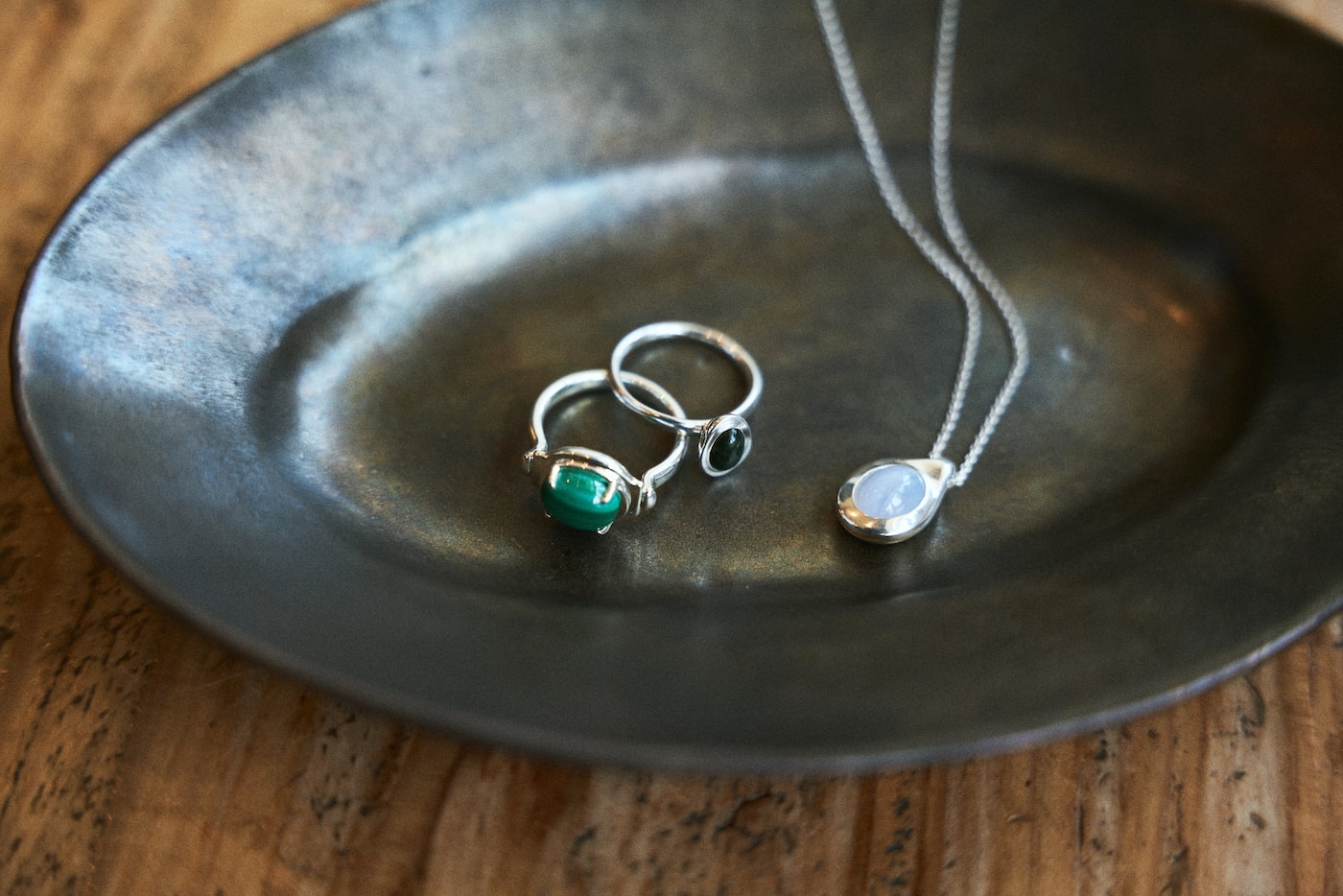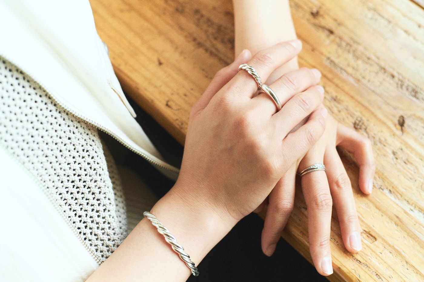 「足していくというよりも引いていく感覚で、必要なものだけを吟味して選ぶようにしています。ピアスが素敵だったらリングやネックレスはあえて引いてみる。ボリュームのあるジュエリーをつけるときは他と合わせたりせず、ひとつだけで。自分の身体にしっくりくるバランス感覚を大切にしています。洋服も一番自然体でいられるものを選ぶのですが、eteのジュエリーは着け心地がよくて肌に馴染むので、着けているのを忘れてしまいそうになりますね(笑)。とくに木の根がモチーフになっている有機的な曲線は年月を感じさせる表情が素敵で、古着と合わせてみたいなと思いました」