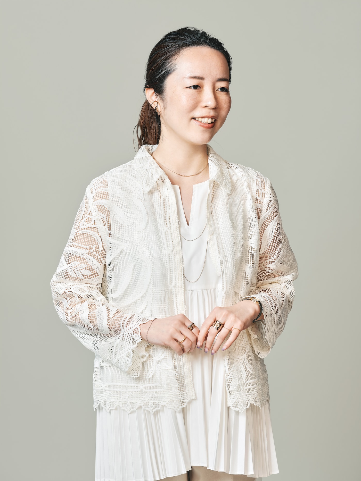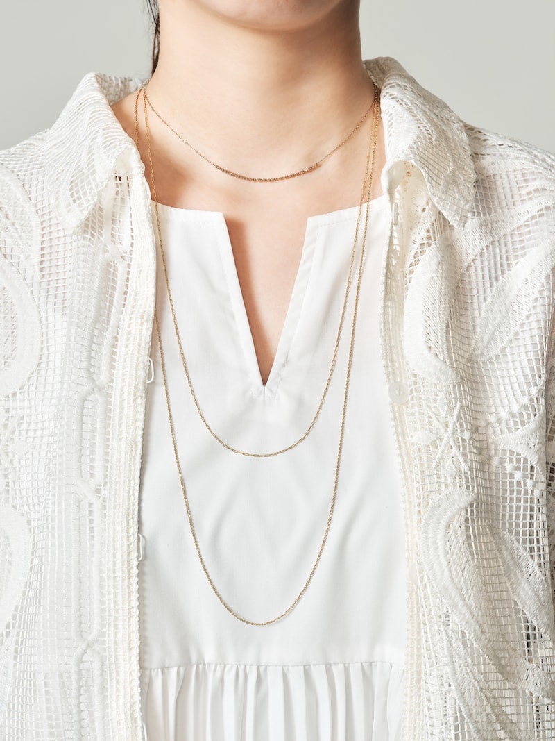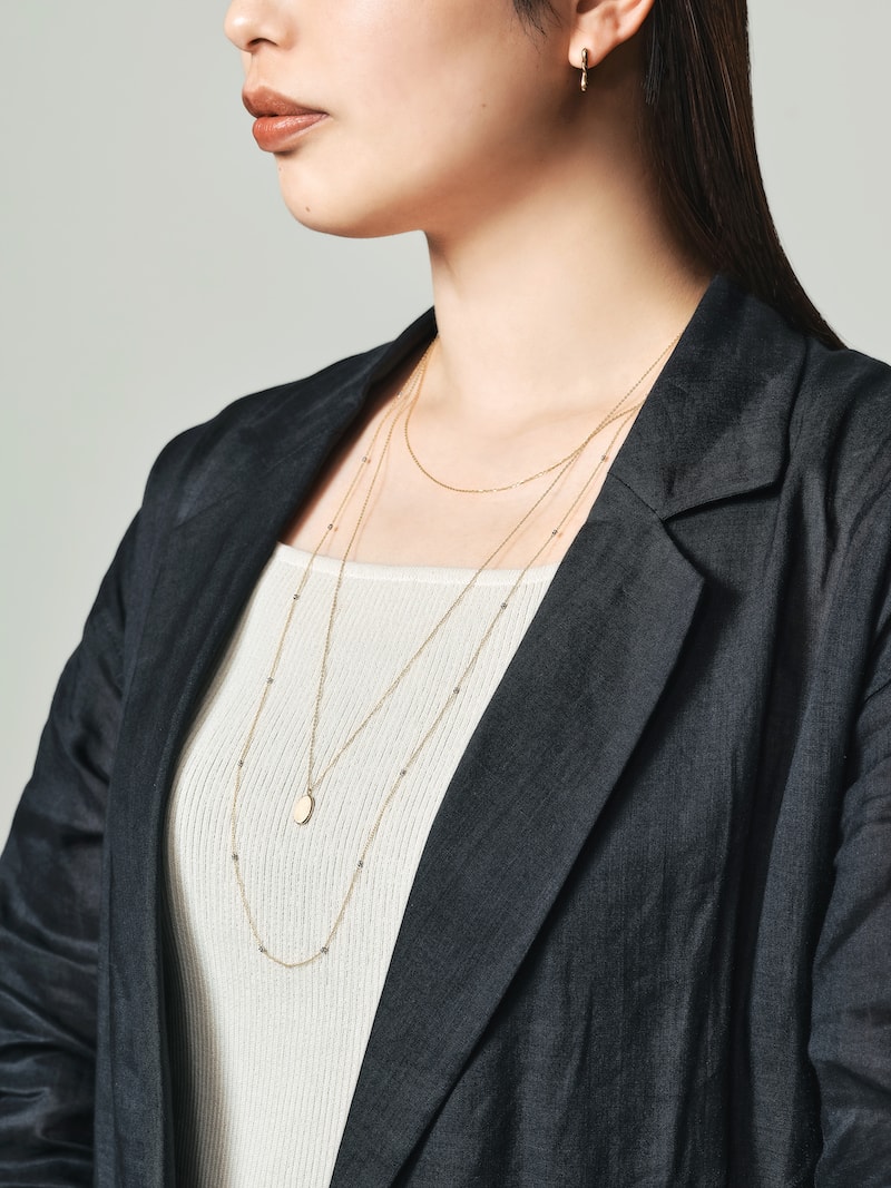 「顔まわりをすっきり見せたいなら、『縦のライン』を意識すると良いと思います。首元にはネックレスを3本重ねているのですが、下に重心を置くように縦のレイヤードに。イエローゴールドでまとめてしまうと重たい印象になってしまうので、プラチナ×イエローゴールドのコンビカラーの『e_Grain〈グレイン〉』を取り入れつつ、スッキリとしたIのラインを見せられるようにしています。手元も細身なリングを選ぶよりは、ボリュームがありながらも肌の抜け感を感じるデザインをセレクト。『動き』と『余白』のあるリングが、指を細く美しく見せてくれます」