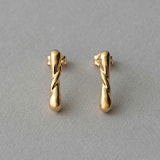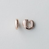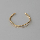 流線型のフォルムが新鮮な「フローピアス」は、耳に地金が貫通しているような不思議な見え感が叶うピアス。雫のような縦長のラインが顔周りをすっきりと見せてくれ、一見するとイヤーカフのようにも見えるのがポイント(SとMの2サイズ展開)。また「Bangle〈バングル〉」コレクションからは、手元のレイヤードスタイルが1本で楽しめるアイテム(上)も登場。肌になじむようツイストする地金のラインに、動きのあるデザインチェーンが繊細な表情をプラスしてくれる。