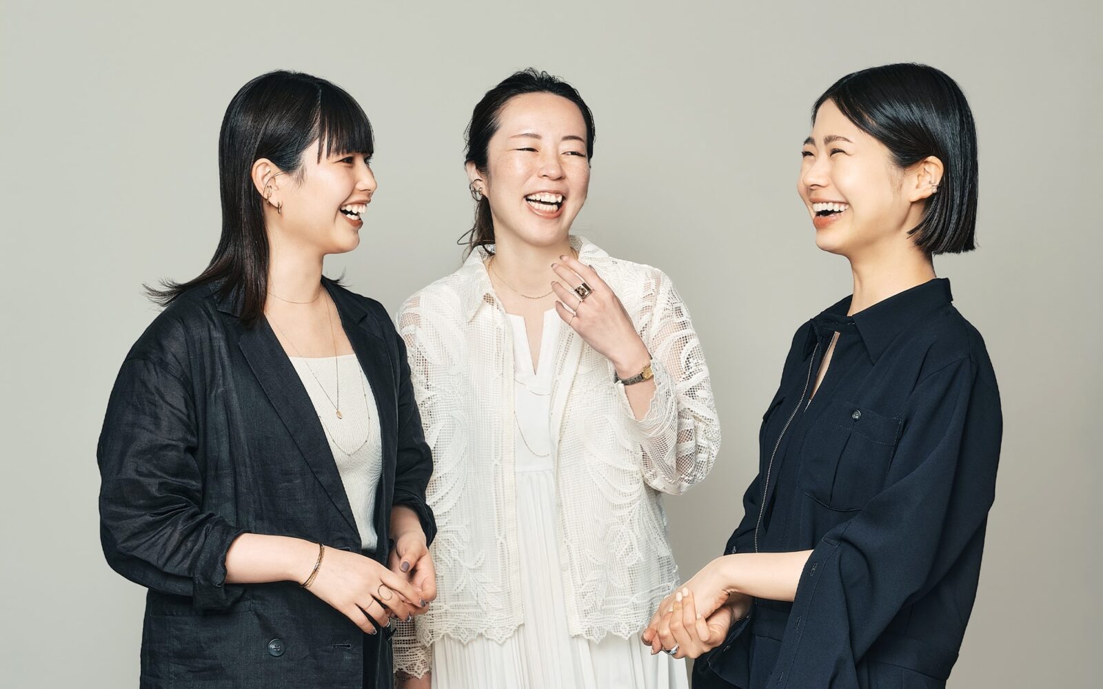 「はじめてのジュエリーとして取り入れたいのは、シンプルでシーンを選ばないネックレス。主役でも脇役でもなく、スタイリングの軸を作ってくれるような、ベーシックなものを1本。年齢を重ねても永く使えるよう、素材を重視したものを選ぶことをおすすめします。今回選んだネックレスは定番コレクションのひとつで、リニューアルしたばかりの『e_Grain〈グレイン〉』。K18素材の艶感と、石を使っていないのに繊細で動きのあるカットボールのきらめきが、首元のラインを美しく華やかに見せてくれます。最初のリングを選ぶなら、細身で動きのあるものを。人差し指を基準にフィットするサイズを選んでおくと、左右共に人差し指、中指とその日の気分でつける場所も選べるので取り入れやすいと思います」