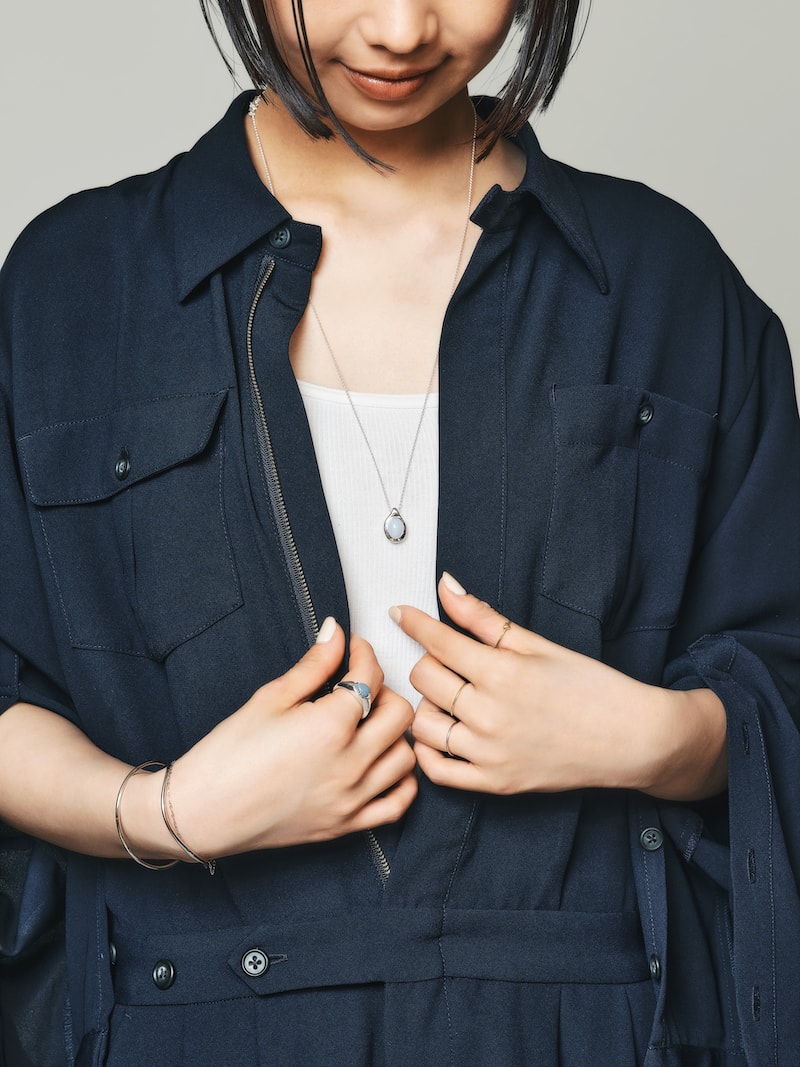 「簡単に夏らしさを取り入れるには、清涼感を意識して、ゴールドよりはシルバー、天然石の色は寒色系に。スタイリングの基本として、まず主役となるアイテムを決めて、あとはボリュームとカラーの引き算で考えます。今回主役に選んだのは夏らしい色合いと有機的な縞模様が涼しげな天然石・ブルーレースアゲートがあしらわれた『roots〈ルーツ〉』コレクションのロングネックレス。同じく天然石を使ったete bijouxの『Limited Stone〈リミテッドストーン〉』コレクションから神秘的な色合いのブラックオパールのリングを合わせてみました。色に個体差がある天然石なのですが、あえてブルーが強く出ているものをセレクト。シルバーアイテムだけだと抵抗があるという方は、細身のイエローゴールドのリングを差し色に取り入れると、さりげないコンビカラーを楽しめます」