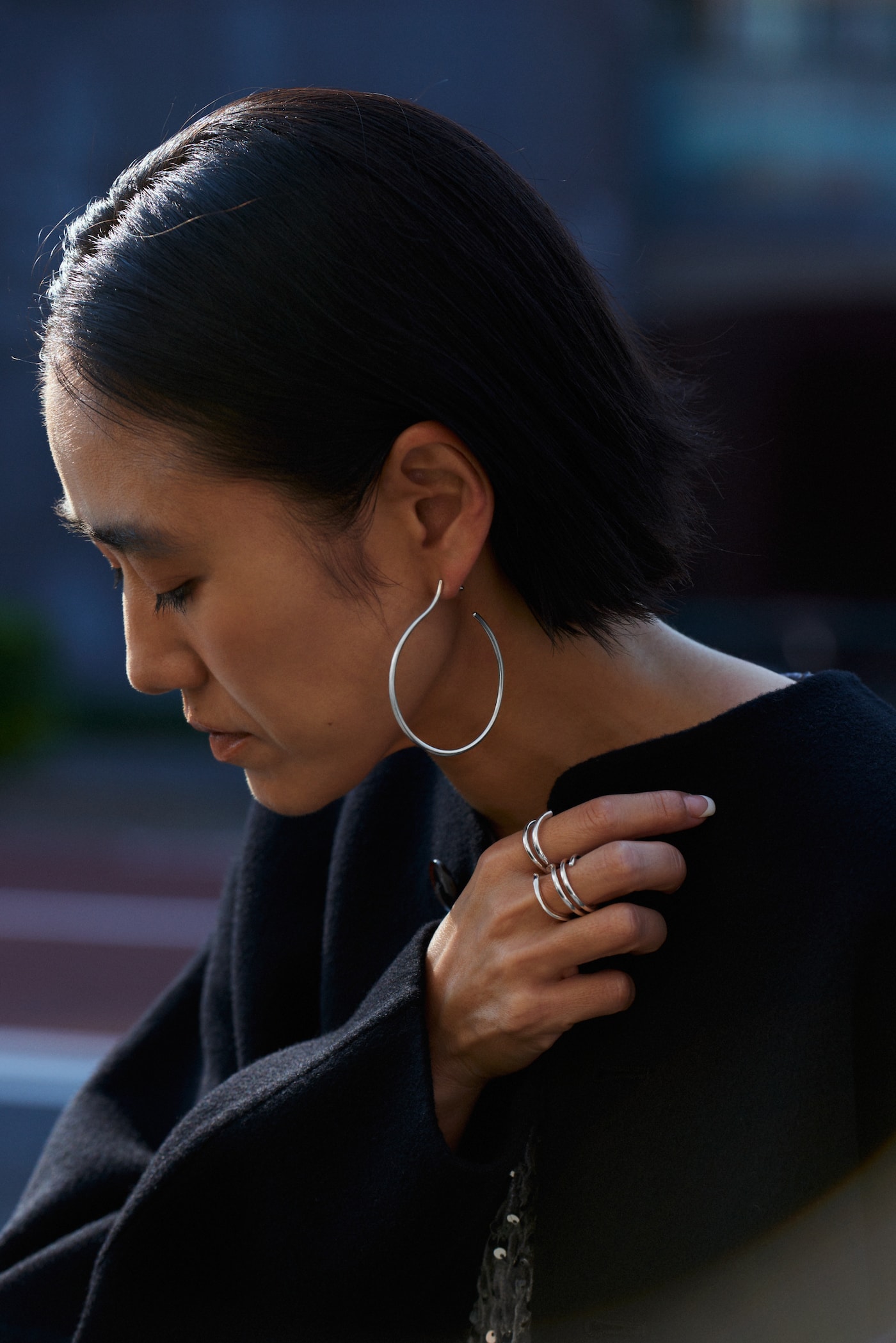 金子さんによるジュエリー選びのコツは、スタイリングに華を添えてくれる存在かどうか。自然へのオマージュを捧げた“Re-grow”のリング2種とフープピアスのミニマルな魅力がスタイリッシュさに磨きをかける。「ソリッドなデザイン性でアクセントにちょうどよく、存在感があるのでワンポイントアイテムとして着けるだけで印象が大きく変わりますよね。それでいてベーシックな装いとの相性がいいので、いつもと違う表情を楽しみたい方の気分にもぴったりだと思います」