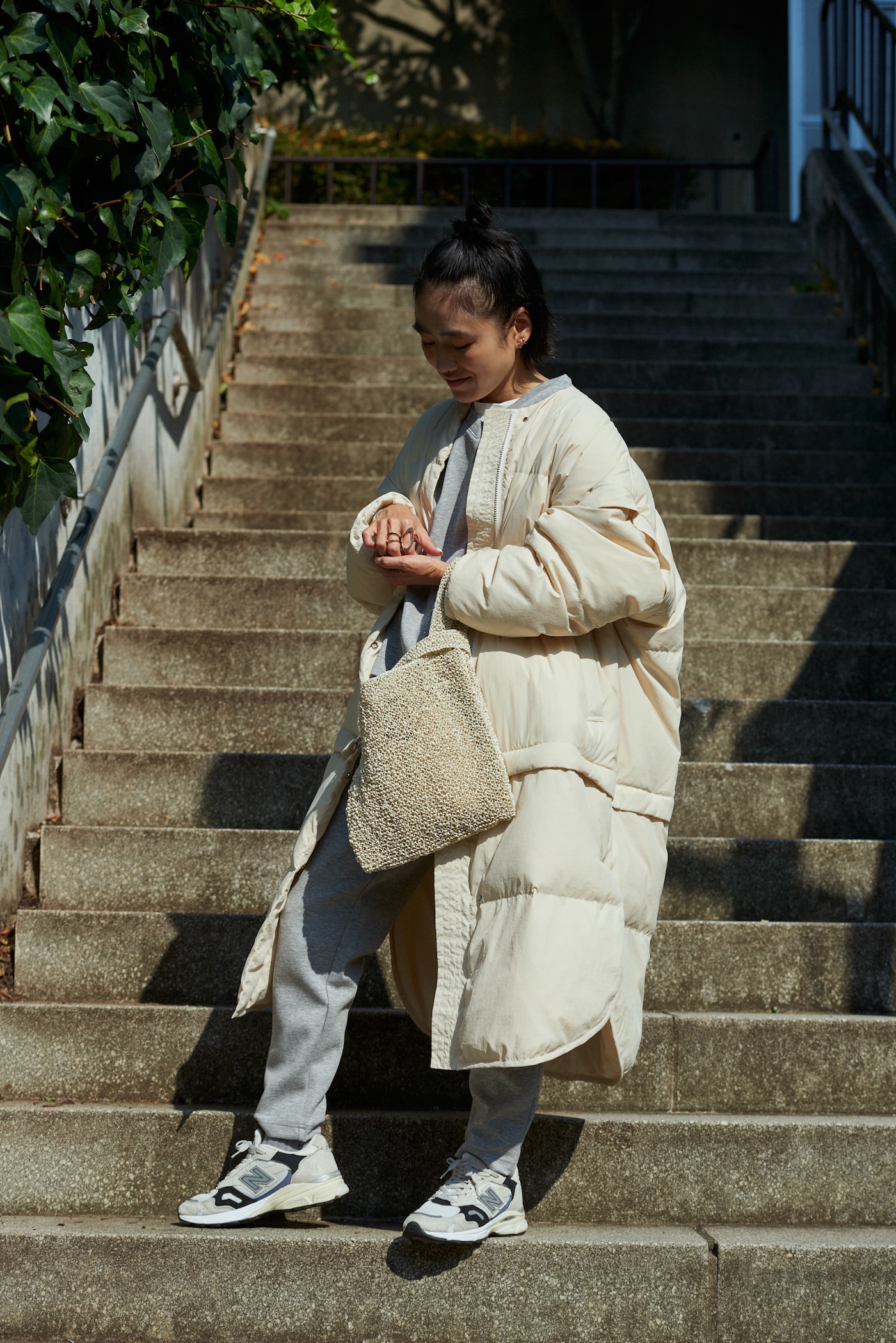 「スウェット素材のセットアップは動きやすくて気軽な存在ですが、カジュアルに見えすぎてしまうことも。そんなときはダウンコートやスニーカーなど他のアイテムも同系色で揃えて綺麗にまとめるようにしています」