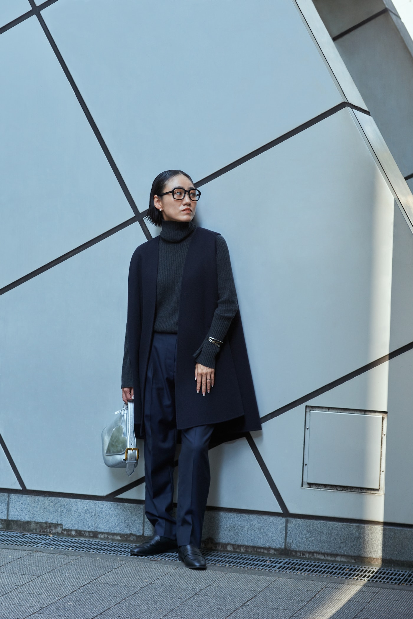 打ち合わせや洋服のリース、スタイリング組みに撮影など、金子さんの仕事モードのスタイルに必ず登場するアイテムの1つ、程よくハリ感があるネイビーのスラックス。