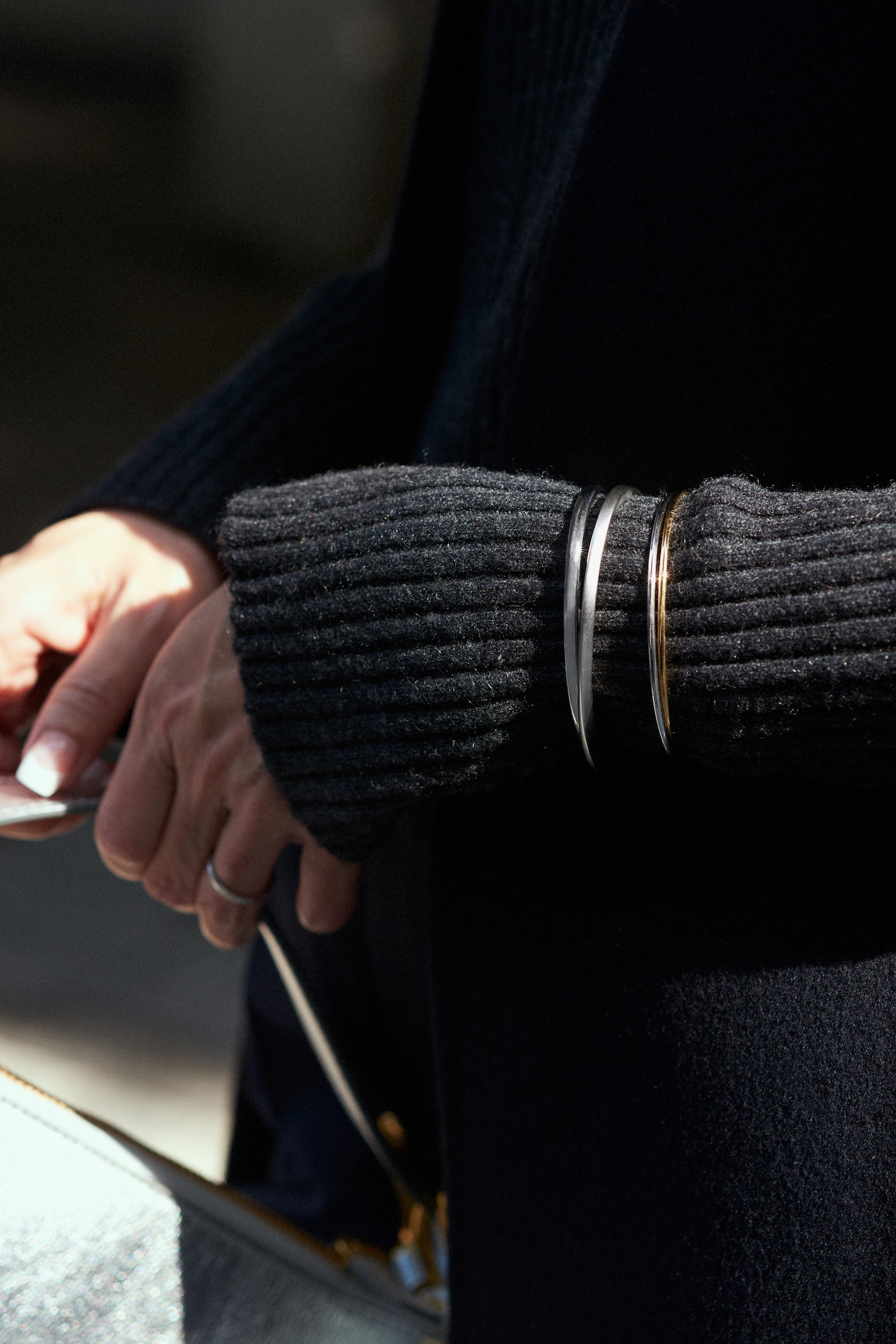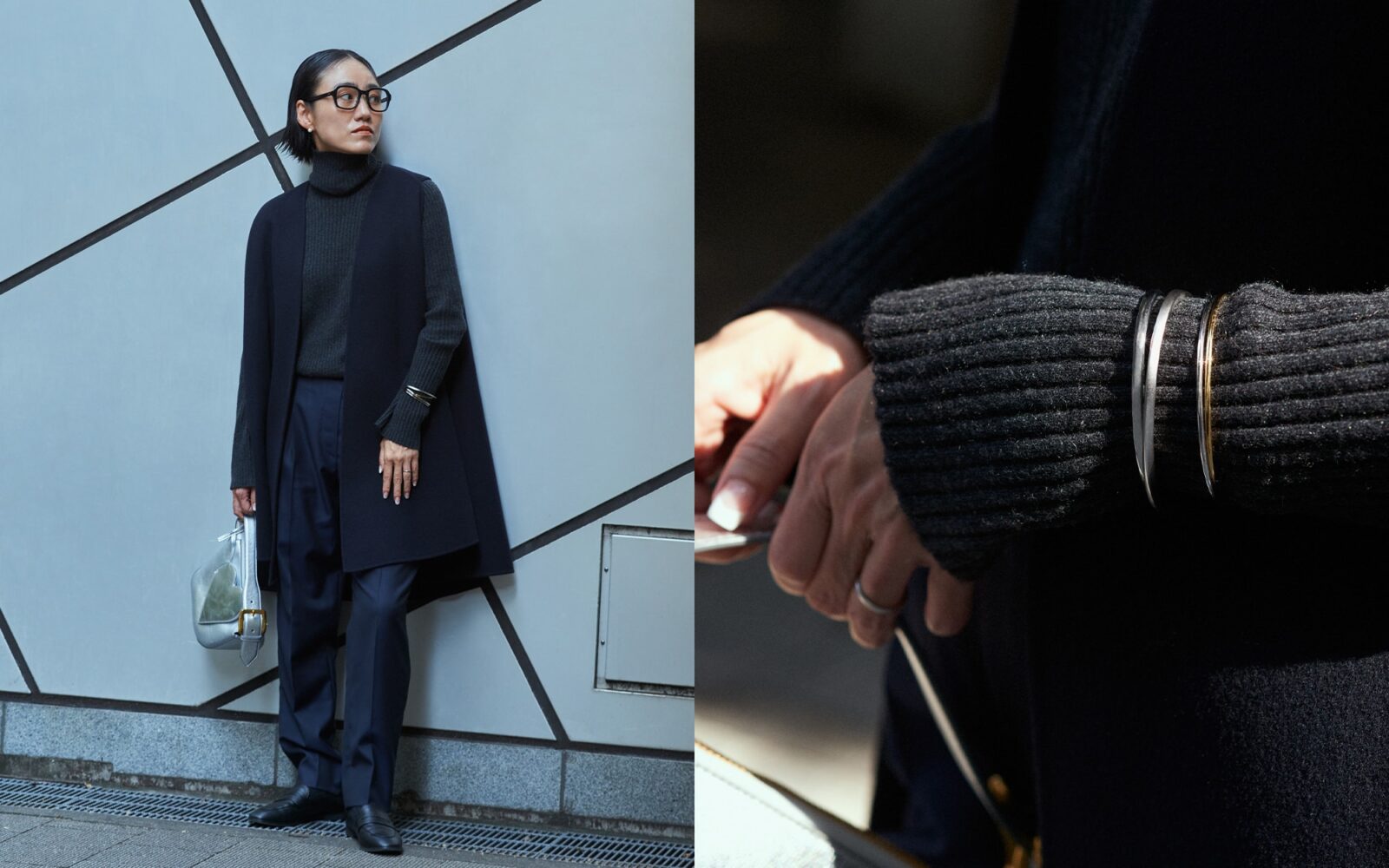 身に着けたバングルはすべて異なるデザイン。素材、太さ、加工が異なる4本をあえて選んだ理由について「シルバーとゴールドのジュエリーをミックスすることに抵抗がなく、むしろ一緒に着けるとスタイリングに奥行きが出てモダンに見えると思っていて。今回は欲張り仕様で4つ重ねてみました(笑)。心地よいバランスは感覚的にシルバーとゴールドで半々くらいかな」と金子さん。スタイリッシュかつ豊かな表情を演出してくれるバングルの魅力をぜひ自身でも試してみて。