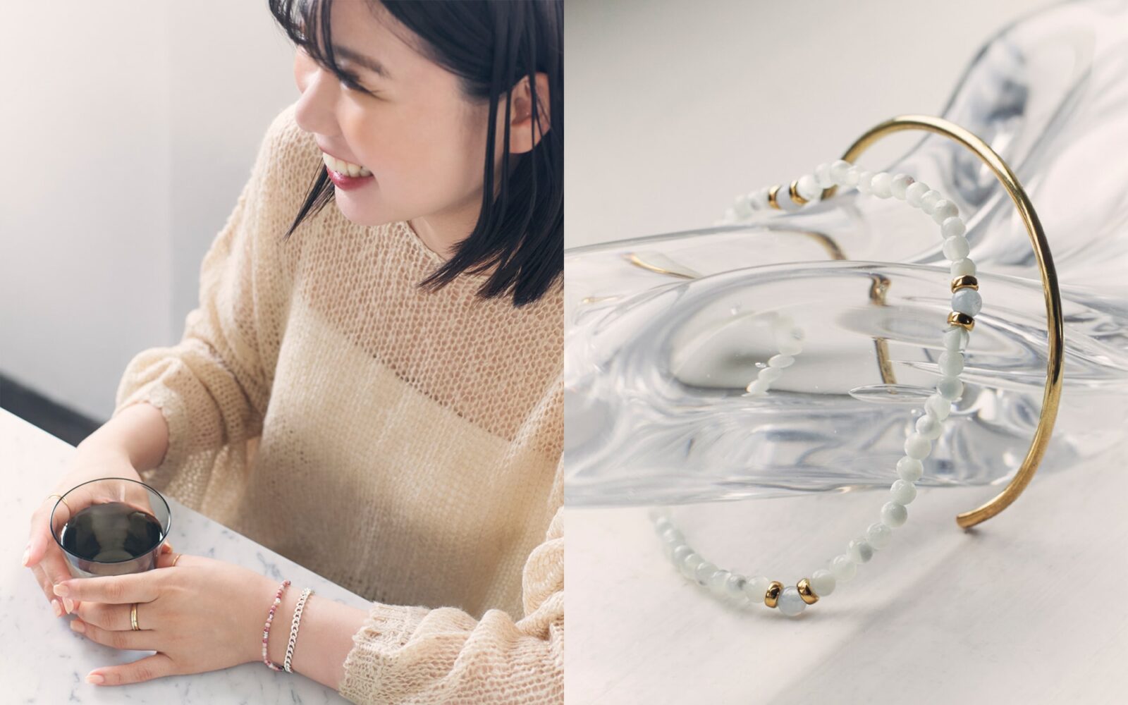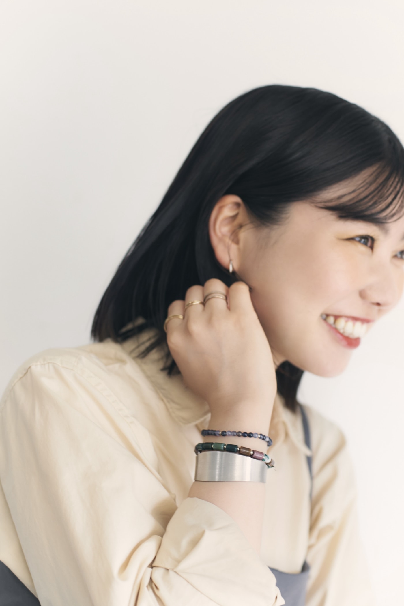 「樹木希林さんの本『一切なりゆき』の中に、“今日用があることに感謝しながら生きる”という言葉があって。本を読んでから時間は経っていますが、この言葉に出会ったおかげで、楽しく仕事ができる環境や友人と会う約束など、何気ない日々が実は喜びに満ちていると改めて気づくことができました。毎朝のジュエリー選びも、その日の予定を考えながらワクワクする瞬間。特に天然石は、自分が大切にしている思いに立ち返ることができる、お守りのような存在です。私にとっての幸せは、“自分と関わる全ての人が笑顔でいられる”ことなので、その気持ちを後押ししてくれるジュエリーを身に着けることが多いですね」(Yokoyama)