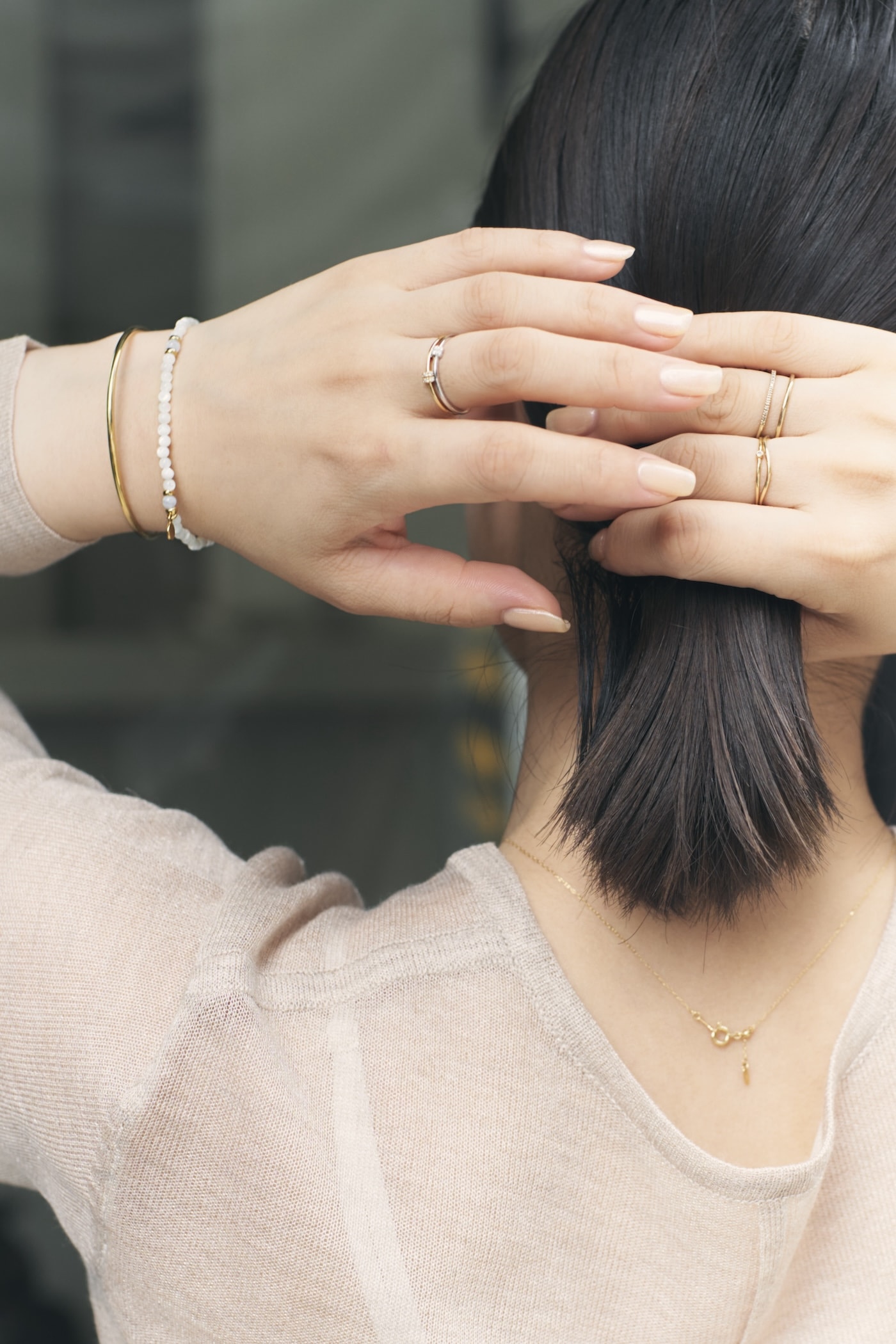 「落ち込んでしまったときも青く澄んだ空やきれいに咲く花を目にするだけで、なんだか幸せな気分になります。私は特に頑張りたい日に、花言葉を調べてから勇気がもらえる花を一輪だけ買いに行くようにしていて。ジュエリーはその日の気分に合うものを手に取ることが多いですが、自分の今の感情に寄り添う石言葉からハッピーブレスのような天然石のジュエリーを選んでみるのも、気持ちを晴れやかにしてくれる素敵な習慣だと思います」(Yokoyama)