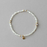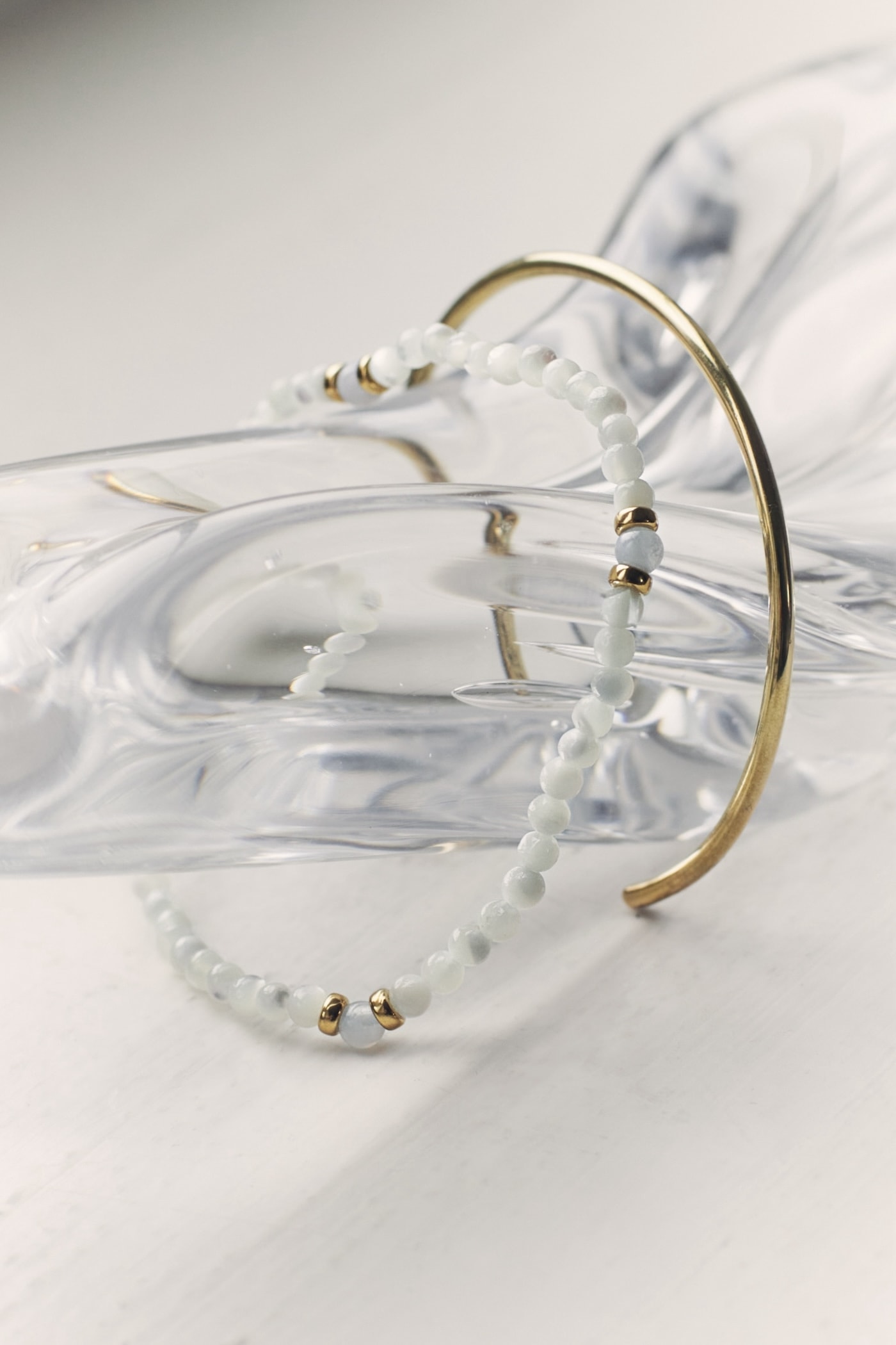 「イエローゴールドは繊細かつ華やかな印象をもたらすカラー。なので、ブレスレットに使われているパーツとバングルの色味を合わせて、女性らしい柔らかなムードの手元を意識しました。ブルーレースアゲートとシェル(白蝶貝)をミックスさせた端正なカラーを損なわないように、やや細身のバングルを選ぶのもポイントです」(Yokoyama)