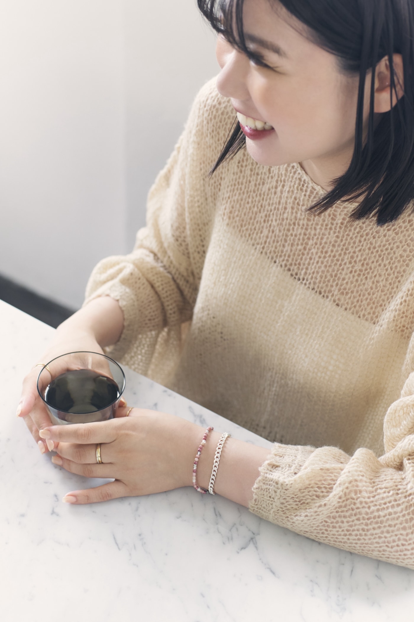 「幸せを呼び込むきっかけは、ちょっとしたことの積み重ねから。例えば落ちているゴミを拾うとか、本当にささいなことでもできる限りの一日一善を楽しむように心がけています。多分、おまじないみたいな意味合いに近いかもしれません。あと、気になった物事は後回しにせず、すぐ行動に移すことを大切にしています。これはジュエリー選びとも通じていて、好奇心を常に持ち続けて行動していくことで自分に合うものや意外な発見に出会えるからです。私はどちらかというと淡色よりはっきりとした色味のジュエリーが肌に合うタイプ。色展開が豊富な“Happy Brace”なら、きっと自分にぴったりなブレスレットが見つけられると思います」(Yokoyama)