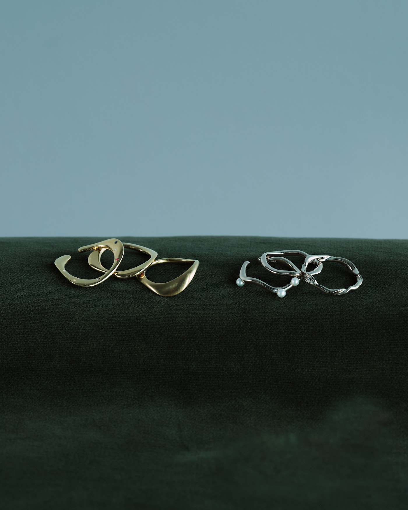 「スタイリッシュさやモードな雰囲気が好きな方におすすめしたいイエローゴールドの“Vivid”。あらゆるシーンでお使いいただけるマルチフルなデザインとなっています。ミストピンクゴールドの“Wavy”はパール使いで雰囲気が柔らかく、フェミニンな雰囲気が好きな方にまさにストライクなデザインだと思います。“ete bijoux Limited”はシンプルなのでお手持ちのジュエリーと合わせやすく、大人の凛としたムードとの相性が抜群。2連風のリングにはエポキシ樹脂をあしらい、シンプルながらも個性を感じるデザインとなっています。通常、エポキシ樹脂を使用する際は地金の色と差をつけたヴィヴィッドなカラーにすることが多いのですが、今回は珍しく地金に馴染むニュアンスカラーで仕上げています。このこだわりは日常使いへの配慮と大人の遊び心から生まれています」