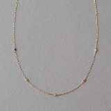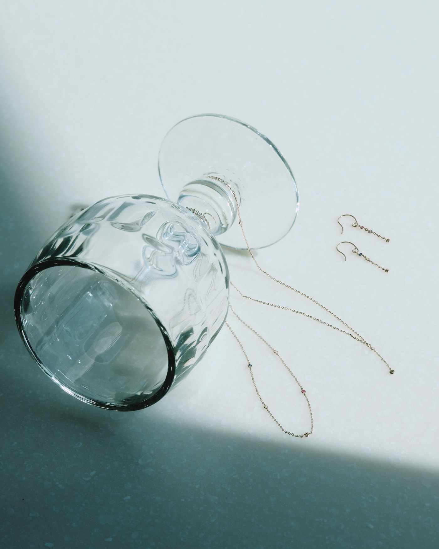 肌の上に煌めく、繊細なカラーストーンとチェーン。光を行き交わせるネックレスとピアスはコレクションのテーマを象徴するデザインでありながら、昨今の自粛によって遠のいた人との大切な触れ合いを再興する意思も込められている。胸元にはホワイトサファイアとブラウンダイヤモンドによるグラデーションが美しく揺れ、左右異なるカラーストーンをあしらった耳元は遊び心たっぷりに繊細な光を届けていく。5つのカラーストーンが点在するネックレスはスライドチェーンを採用。チョーカーのようにタイトに着けるなど、長さによる変化も楽しめる。