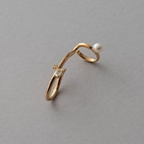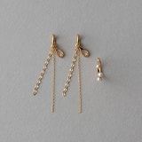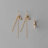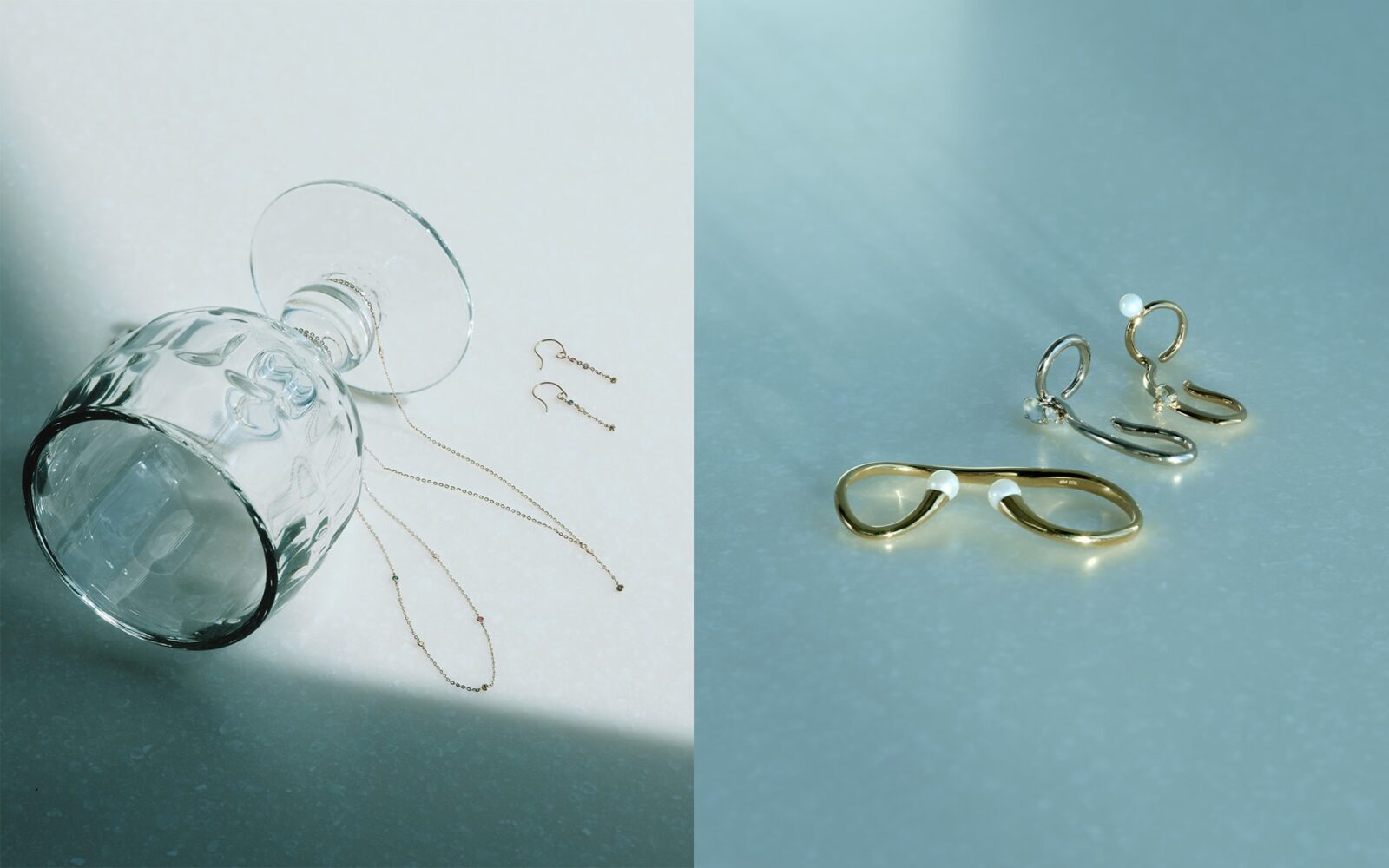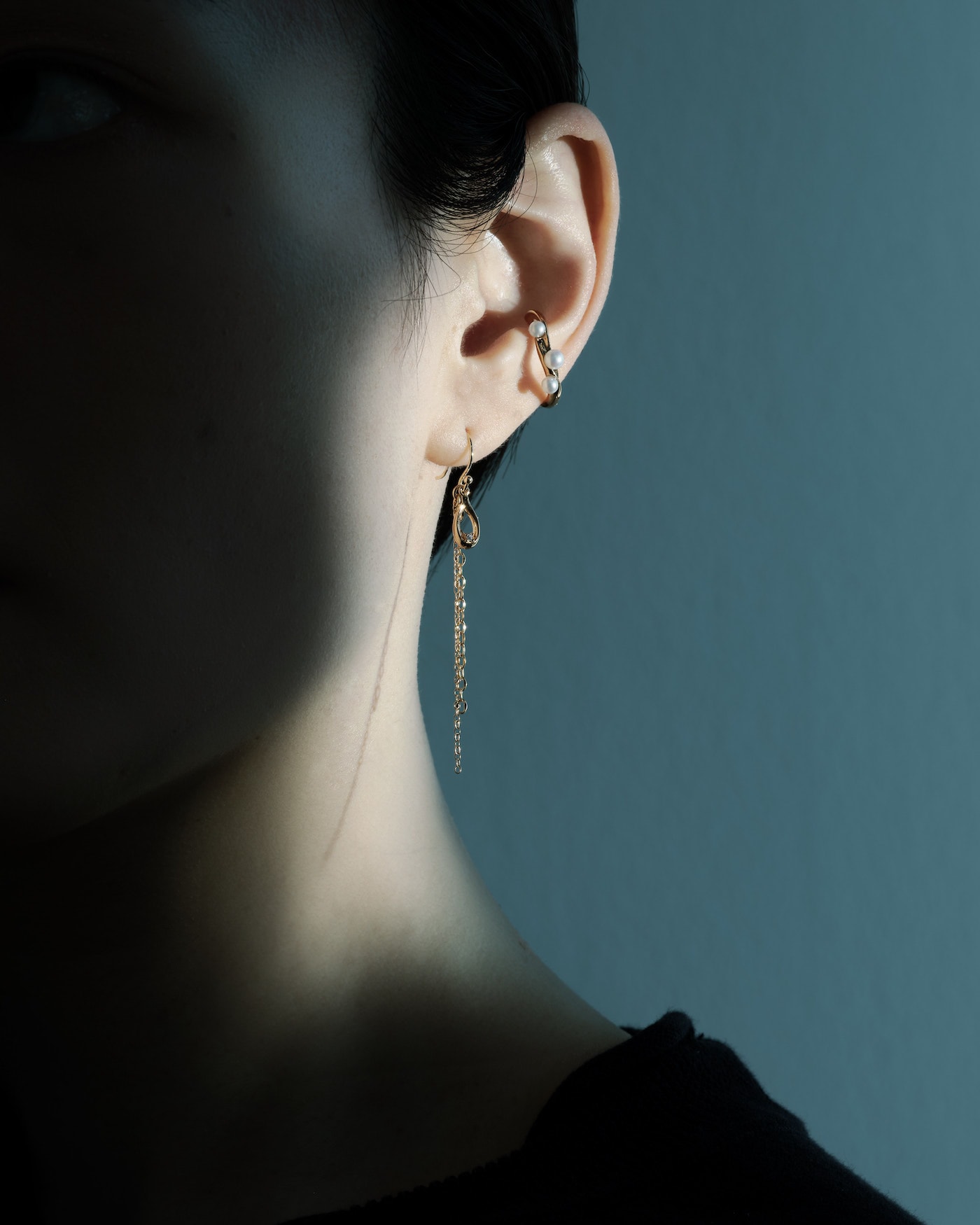 パーツが取り外し可能なピアス&イヤーカフがセットになった“Ear Coffret”(写真上 ※ピアスはイヤリングでも展開)。ドロップ型チャームは“光の輪”、チェーンは“流動する光”、イヤーカフは“街に浮かぶ光の集まり”。それぞれに秘めた思いが重なり合い、動きに合わせて輝きを放つ。“Spread Cuff”(写真下:左&中央 ※左耳用)はムーンストーン、グリーンクォーツ、ホワイトトパーズの異なるカラーストーンがさまざまな光を想起させる。アクティブに繰り出す街を照らす光とのロマンティックなかけ合いを楽しんで。耳を覆うように着用する“Coil Cuff”(写真下:右 ※右耳用)は着けるだけで華やかな印象に。柔らかい曲線を描くシルエットと滴る果実を彷彿させる先端のパールは、大胆なデザインながら日々の生活にもよく馴染む主役級アイテム。