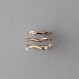 冬の定番コレクションのひとつ“Puzzle Ring”から、“Vivid”、“Wavy”、“ete bijoux Limited”の3種類が登場。生き生きとした光から着想を得た“Vivid”(写真上:左)は、シャープなラインにカラフルなストーンが寄り添うデザイン。リングを上から覗けば、カーブの強弱が生み出したトライアングル状のフォルムが手元に浮かぶ。暖かく包みこむ光をイメージした“Wavy”(写真上:右)は、ミストピンクゴールドのしなやかなラインにランダムに留まった淡水パールと、ひと際輝くグレーダイヤモンドとホワイトトパーズが魅力を誘う。2連リングの間にホワイトパーズのハーフエタニティ調のリングをドッキングしたデザイン“ete bijoux Limited”(写真下)は、ロウブラウンゴールドにつやめく地金と、エポキシ樹脂に施されたニュアンスカラーのラインが大人の遊び心をさりげなく演出する。