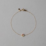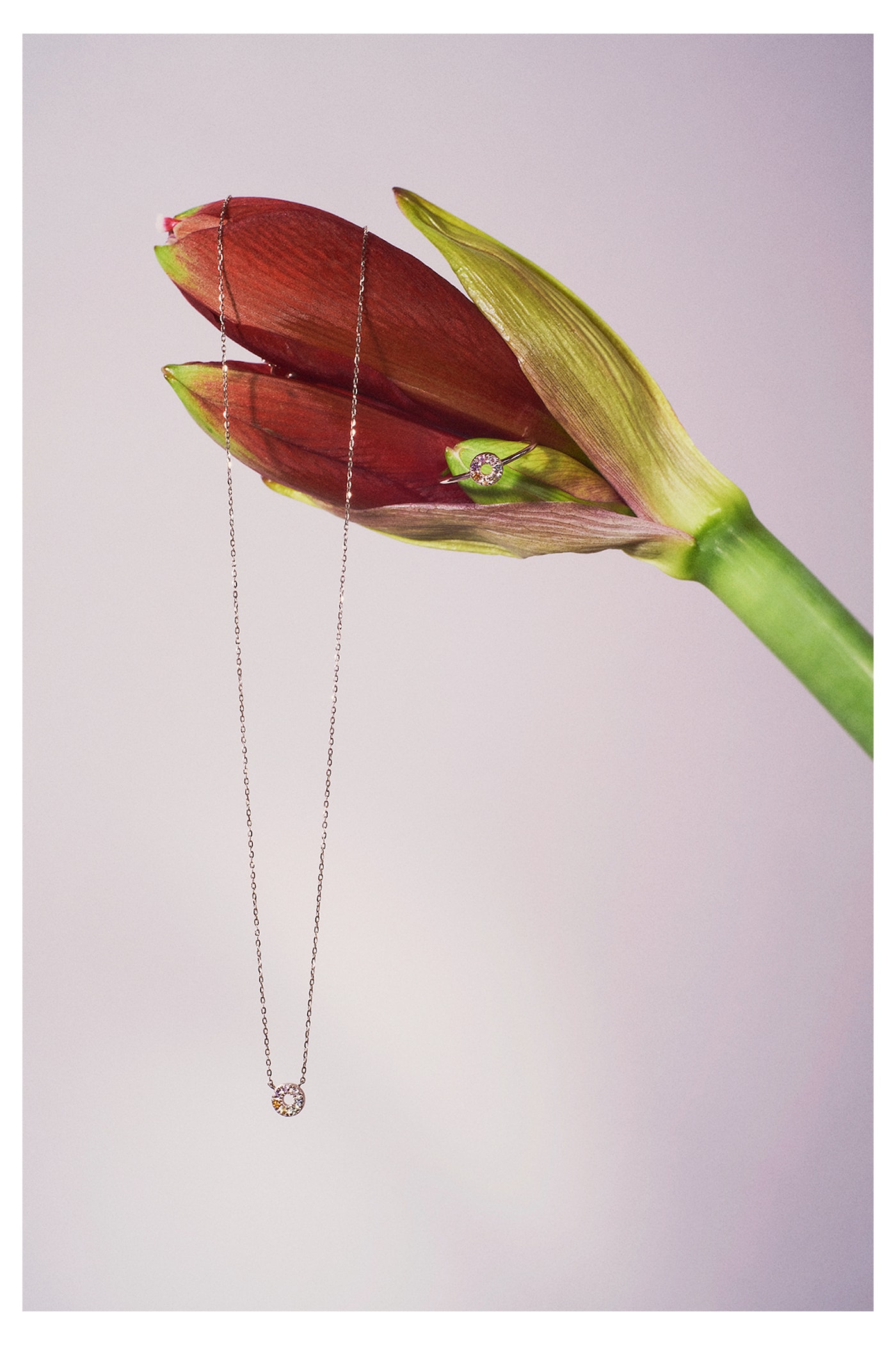 ミストピンクゴールドの“Rainbow”は、ピンクトルマリン・ラブラドライト・アクアマリン・ペリドット・イエローサファイヤ・シトリン・ピンクアメシストの組み合わせが、淡いトーンならではの洗練された大人の品格をのぞかせる。地金との相性もよく、肌に馴染みやすいカラーなので毎日身に着けられる、まさに“お守り”的存在。手持ちのジュエリーともスタイリングしやすいタイムレスなデザイン性を楽しんで。