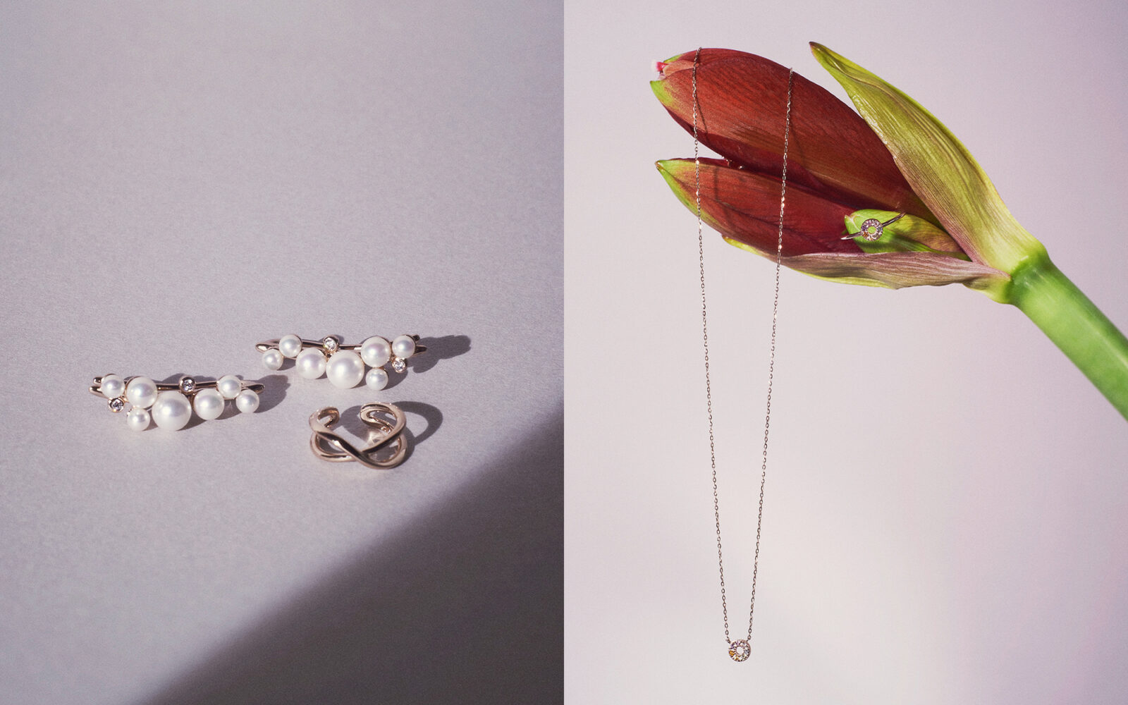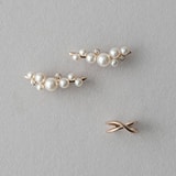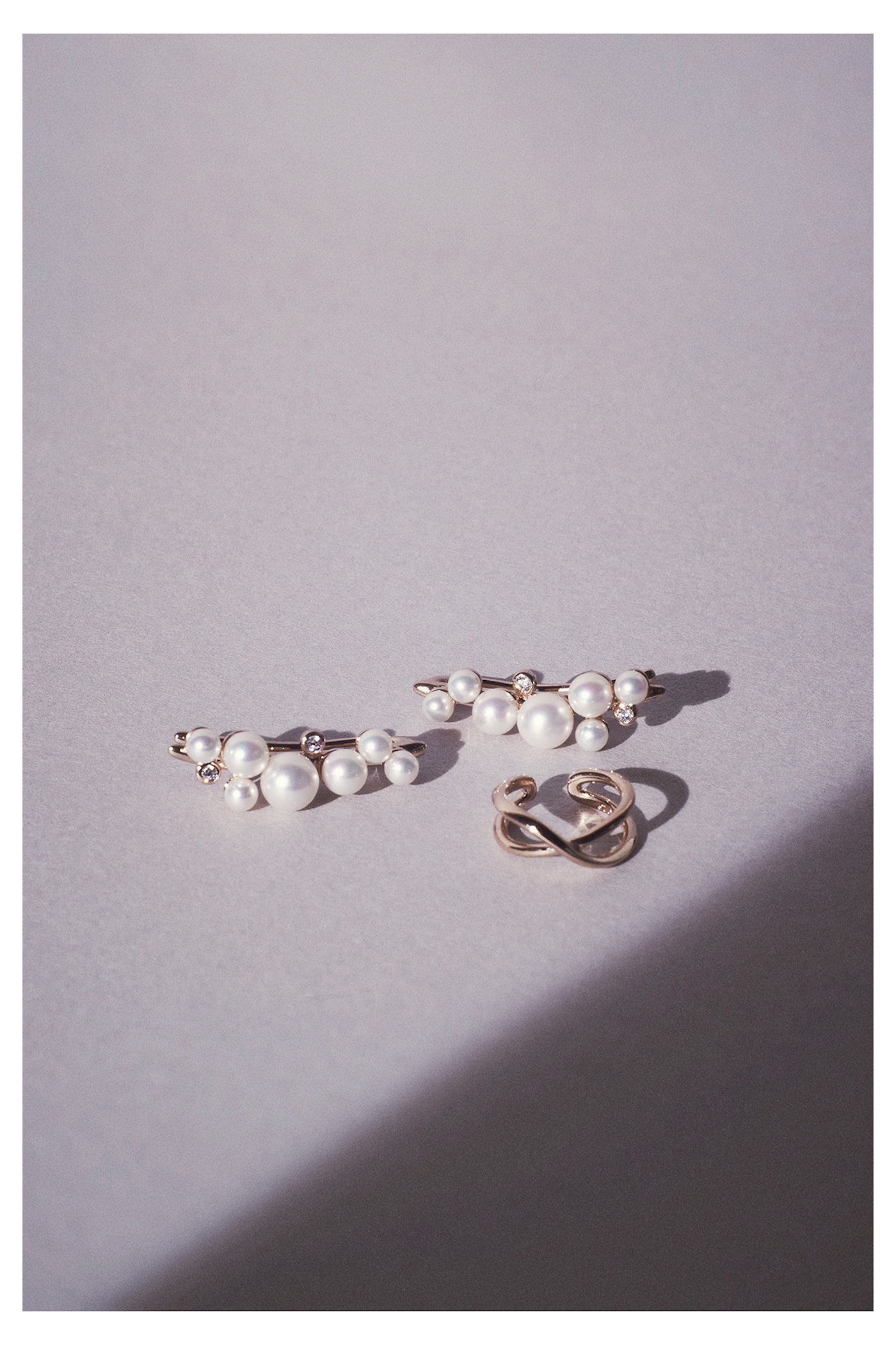 ミストピンクゴールドの地金にランダムな大きさのパールをあしらったイヤークリップと、ソリッドなデザイン性でさまざまなスタイリングに組み入れやすいイヤーカフがセットになった“Day Up”コレクション。健康や長寿などの意味を持つパールは新年のスタートにぴったり、キュービックジルコニアの輝きも加わって身に着けるだけで顔周りの印象を華やかに演出。重くなりがちな冬の装いに、セットでも単体ずつでも楽しめる、明るくてプレイフルなイヤージュエリーを。